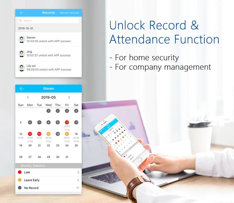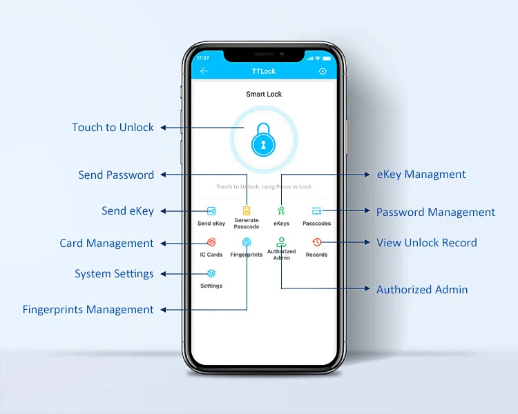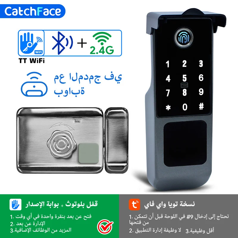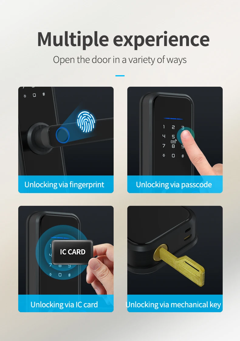 1. خمسة في واحد لفتح القفل: التطبيق، بصمة الإصبع، البطاقة أو سوار المعصم، رمز المرور، المفتاح