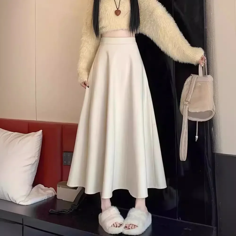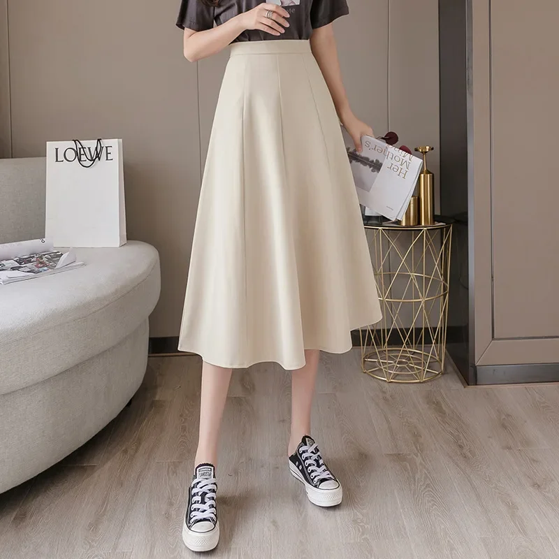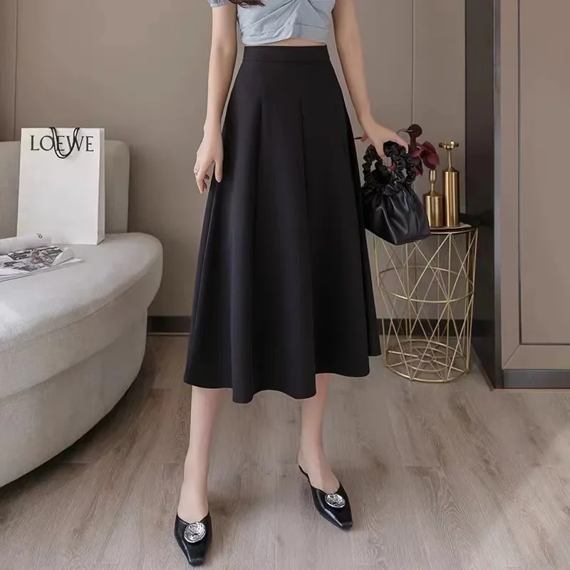 حجم كبير النمط الكوري عالية الخصر ألف خط تنورة ثنيات كامل طول المرأة الصيف أزياء زائد حجم التخسيس نصف الجسم تنورة
