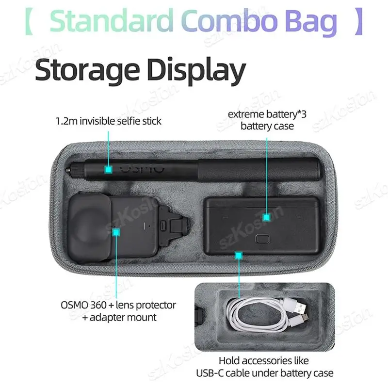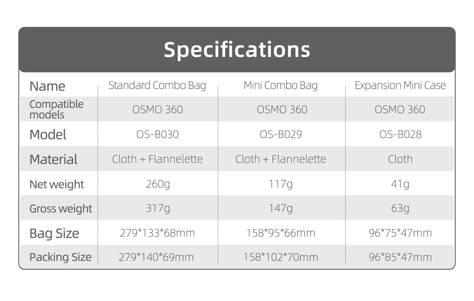 مصممة خصيصًا لـ OSMO 360، هناك ثلاثة خيارات للاختيار من بينها: حقيبة الأدوات القياسية، وحقيبة الأدوات البسيطة، وحقيبة الجسم المفتوحة.مصبوب بدقة لملاءمة آمنة، فهو يحمي الكاميرا والملحقات الخاصة بك من الصدمات والسقوط، مما يوفر حماية مدروسة لمعداتك.