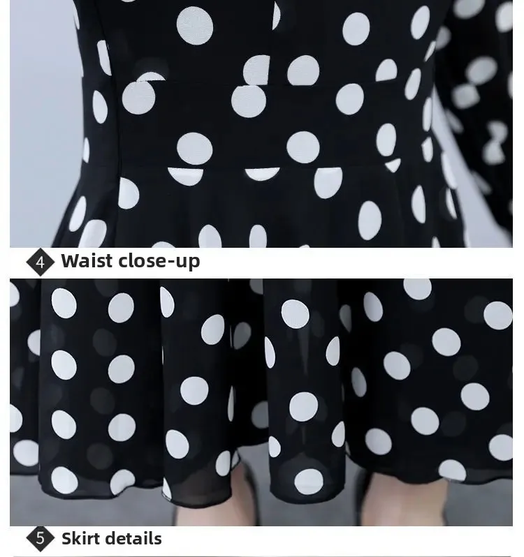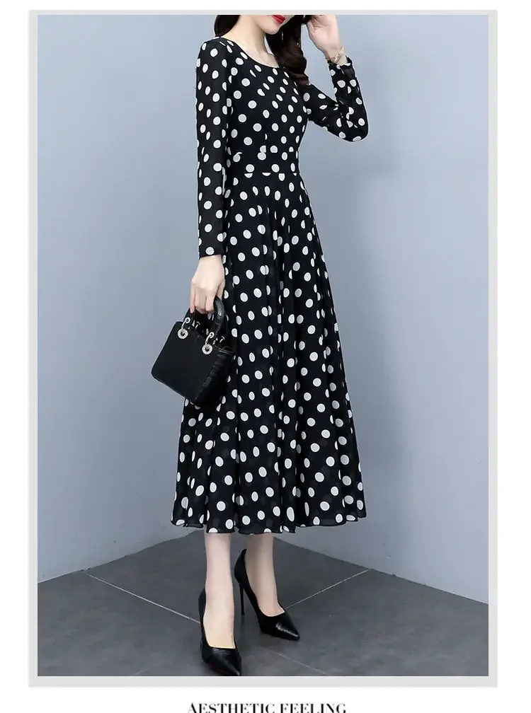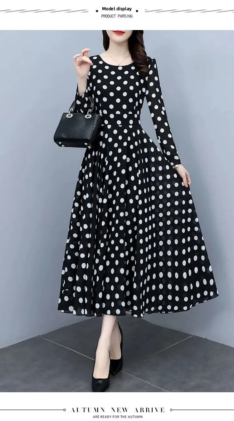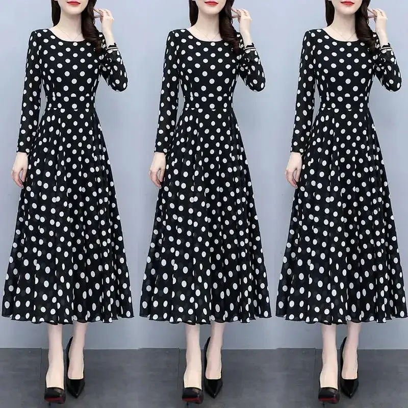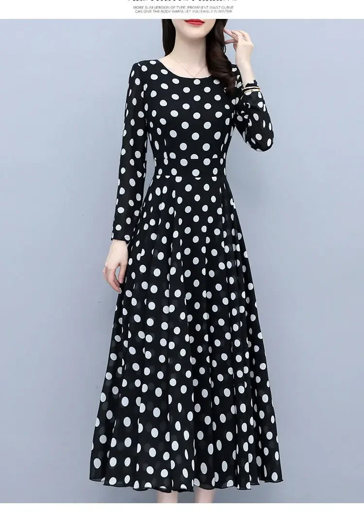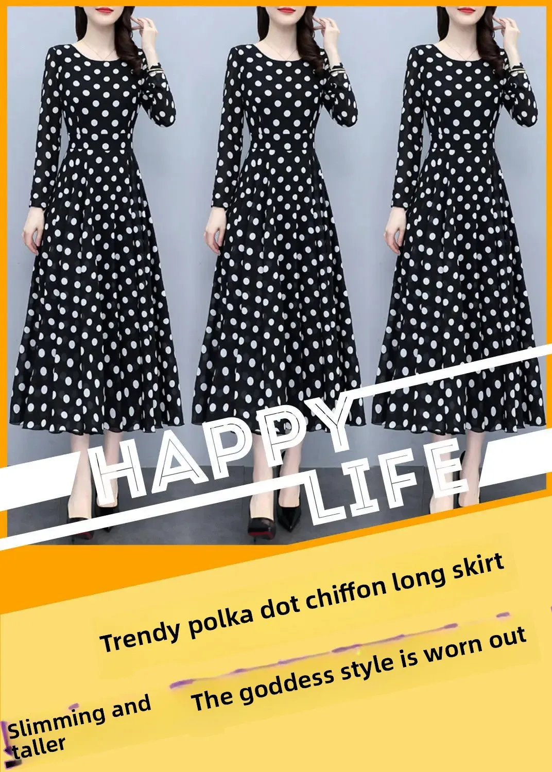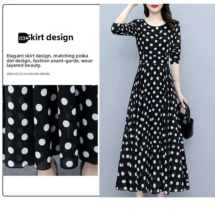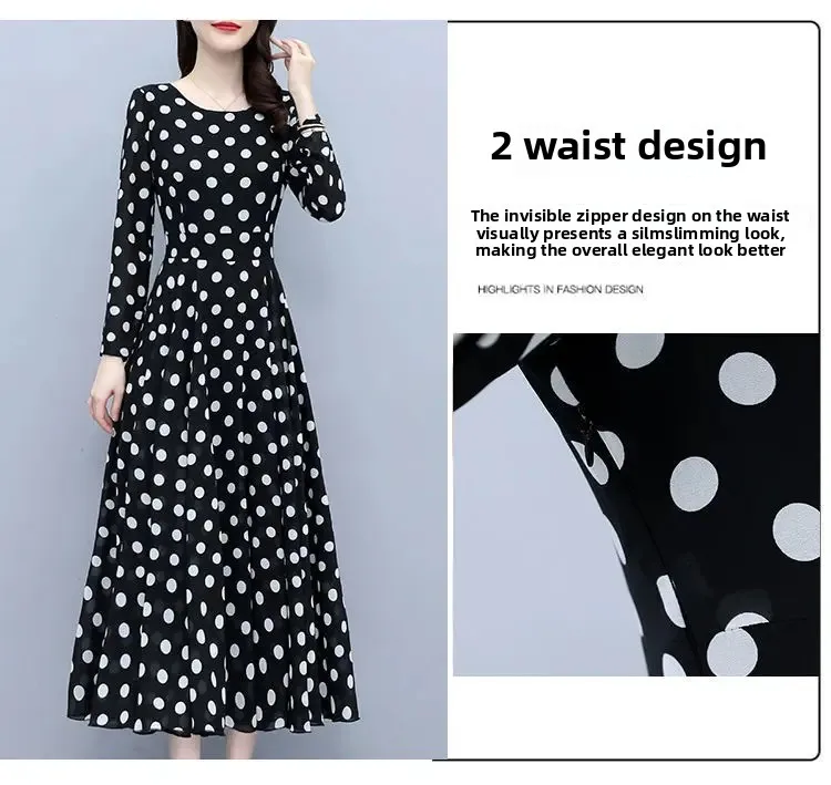 فستان شيفون منقط بأكمام طويلة مقاس كبير للنساء لتخسيس البطن تغطي تنورة كاملة عصرية فستان طويل ربيع جديد وصول