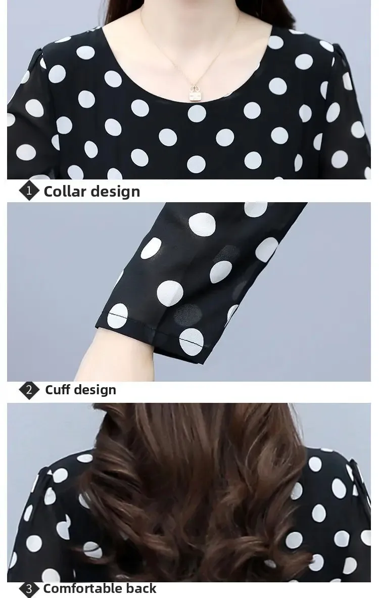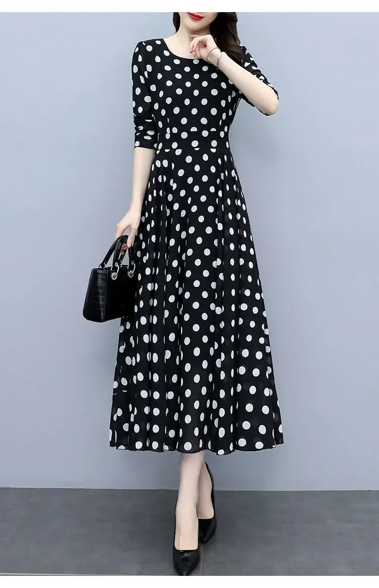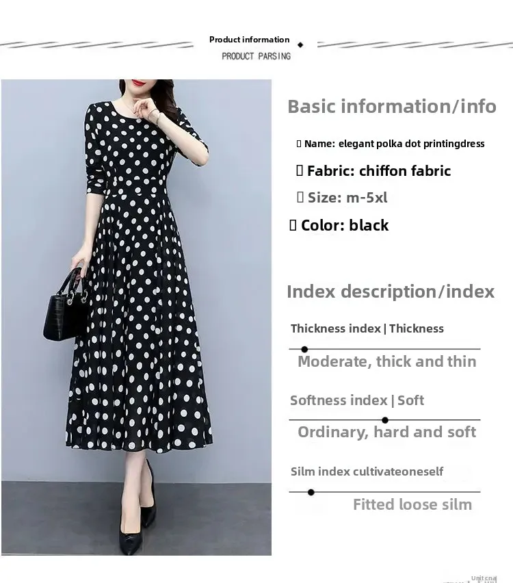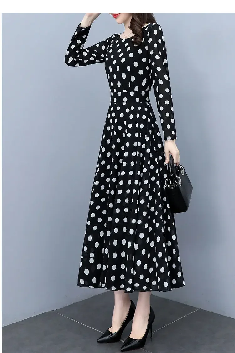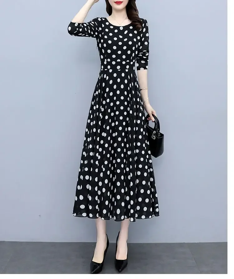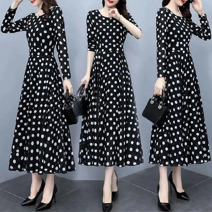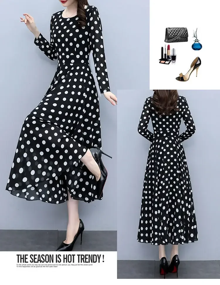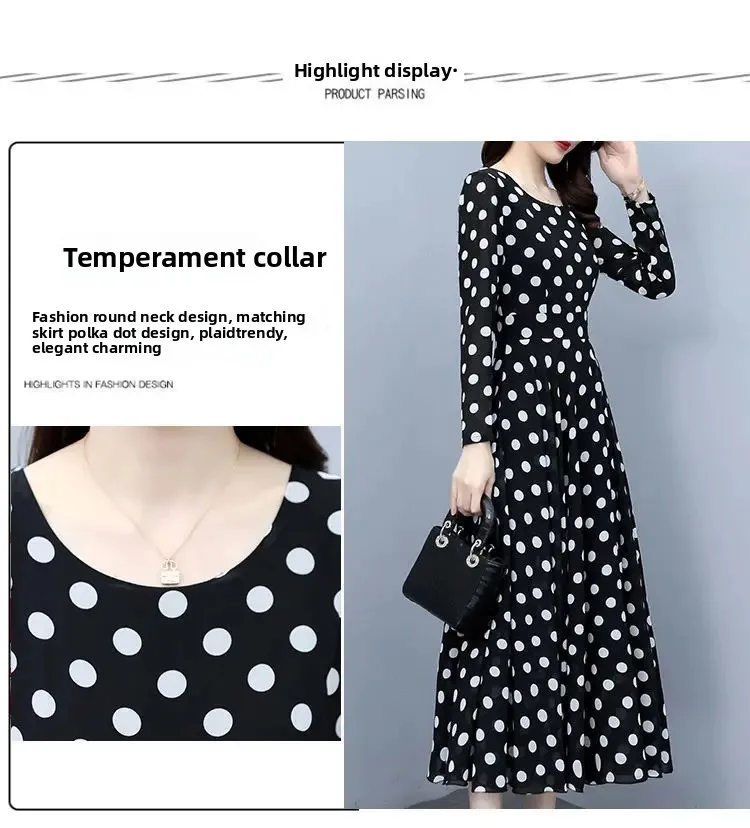 فستان شيفون منقط بأكمام طويلة مقاس كبير للنساء لتخسيس البطن تغطي تنورة كاملة عصرية فستان طويل ربيع جديد وصول