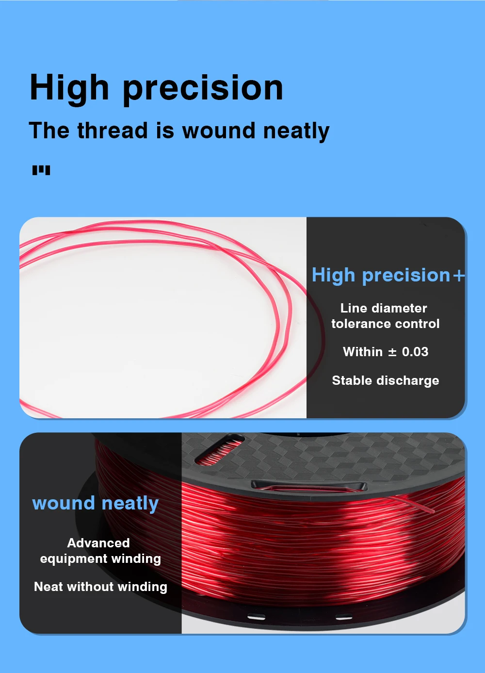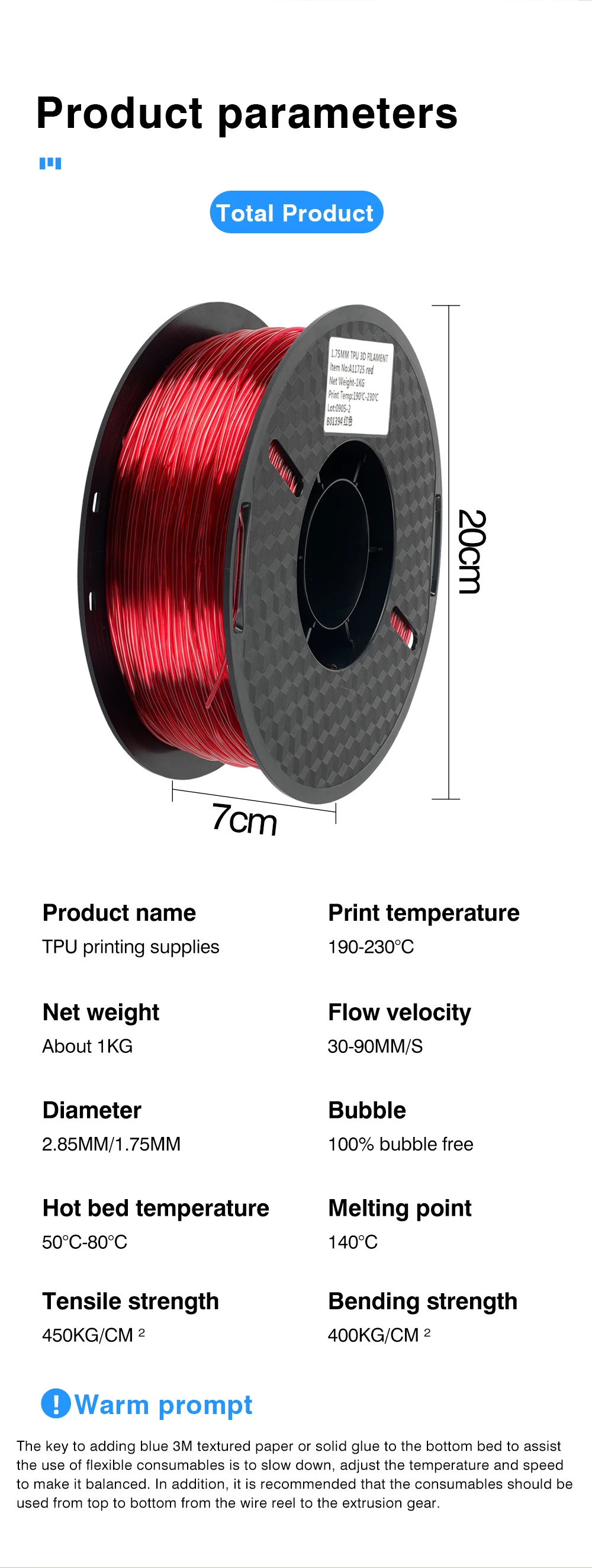 القطر: 1.75 مللي متر التسامح: +/- 0.05 مللي متر صلابة: 95A الكثافة: 1.25 ± 0.05g/cm3 درجة حرارة الطارد: 190 ℃ - 230 ℃ سرعة الطبا...