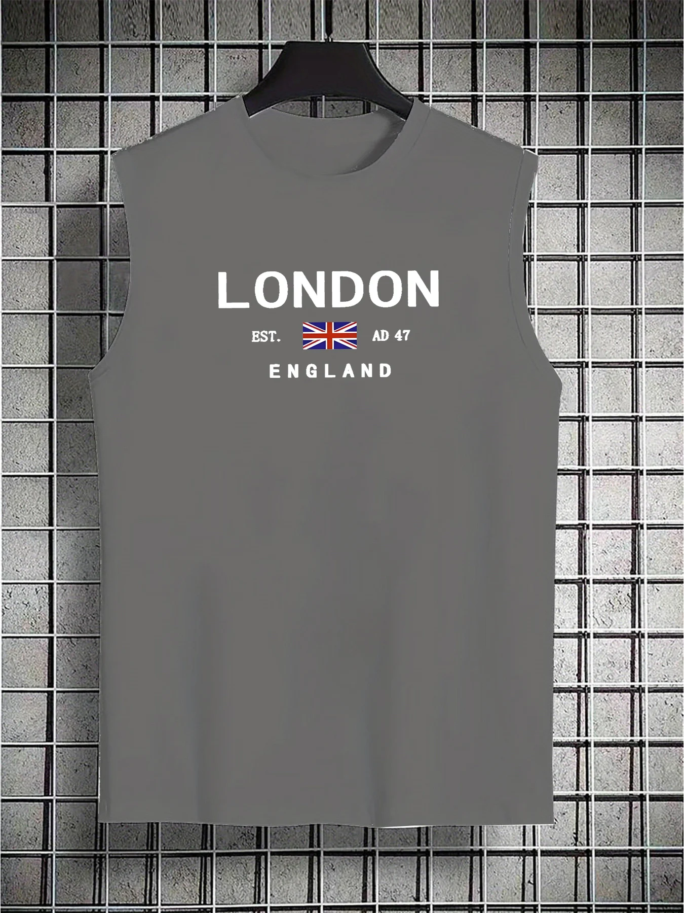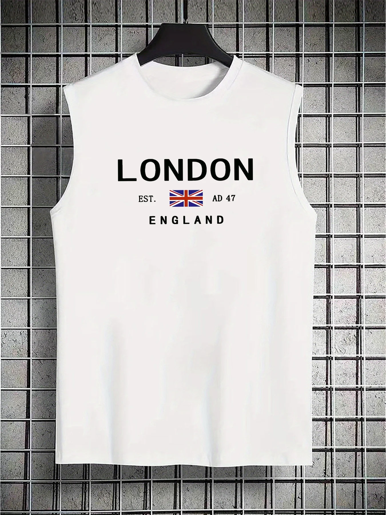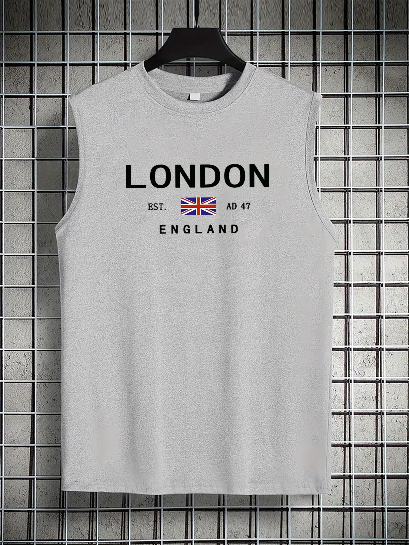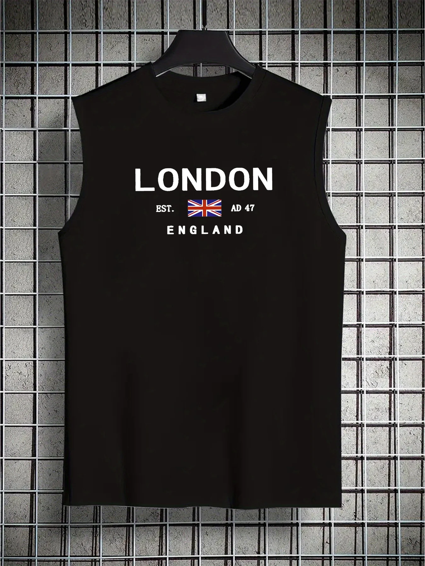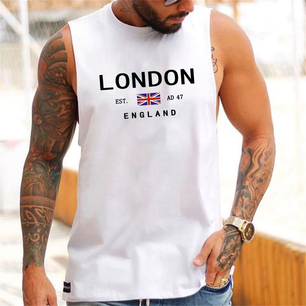 قميص رجالي صيفي للترفيه والرياضة واللياقة البدنية فضفاض بنمط لندن مطبوع مريح وقابل للتنفس برقبة دائرية بدون أكمام