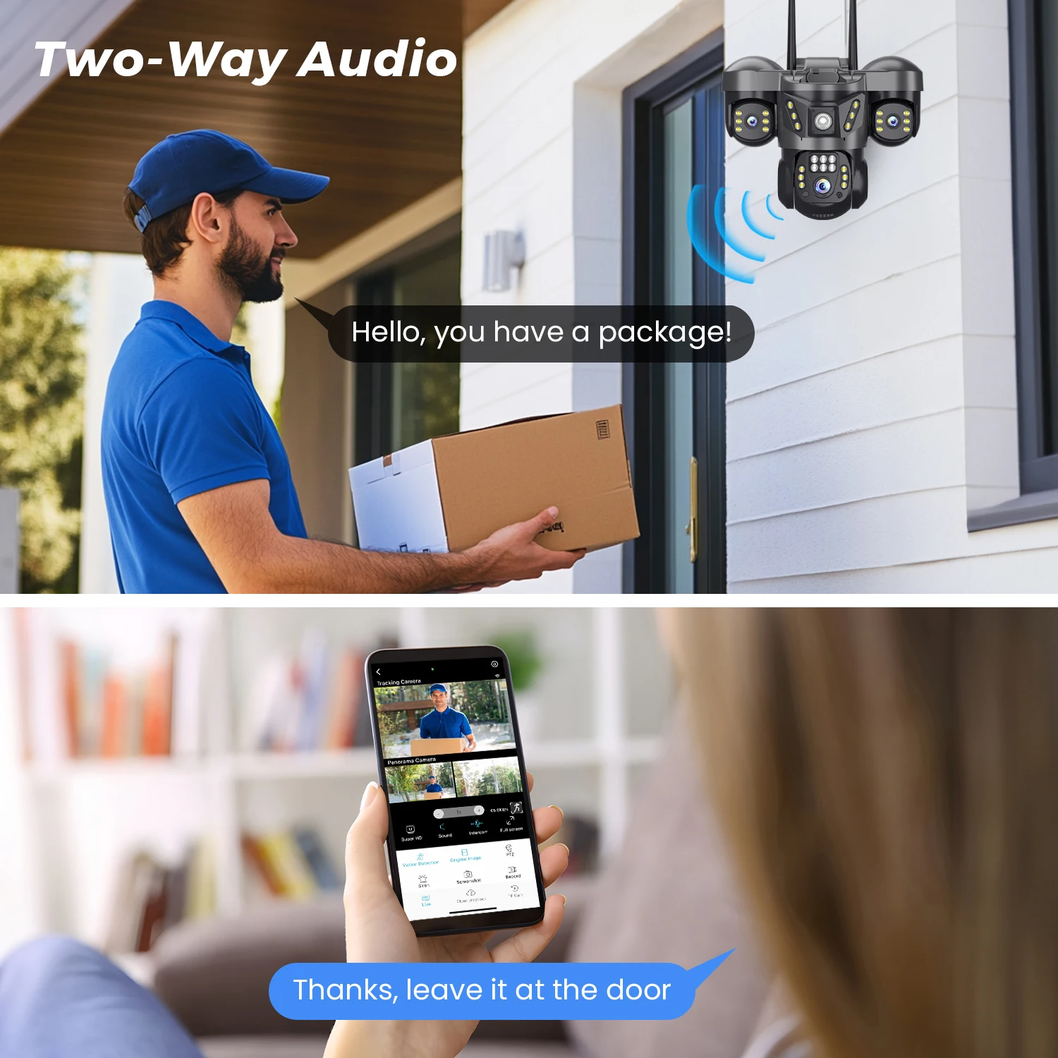 * ميكروفون ومكبر صوت مدمجان. يمكنك التحدث مع أي شخص بالقرب من الكاميرا.عندما لا يكون أي شخص في المنزل، يمكنك تعليم شركة الشحن بوضع الحزمة الخاصة بك في المكان المحدد.