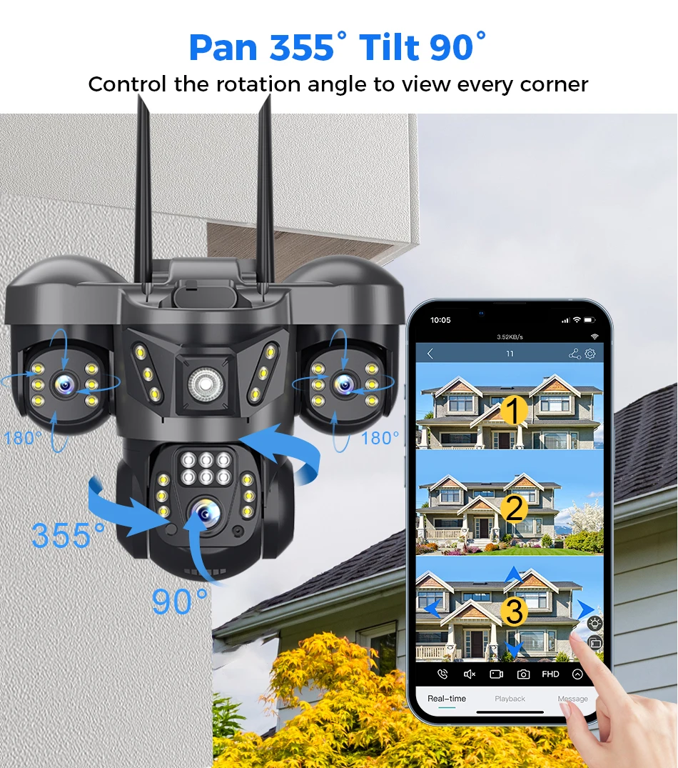 * تم تصميم كاميرا الأمان CCTV اللاسلكية الخارجية مع دوران عمودي 90 درجة وأفقي 355 درجة؛ يمكنك التحكم عن بعد في كاميرا الأمان للمراقبة الشاملة دون وجود نقاط عمياء.