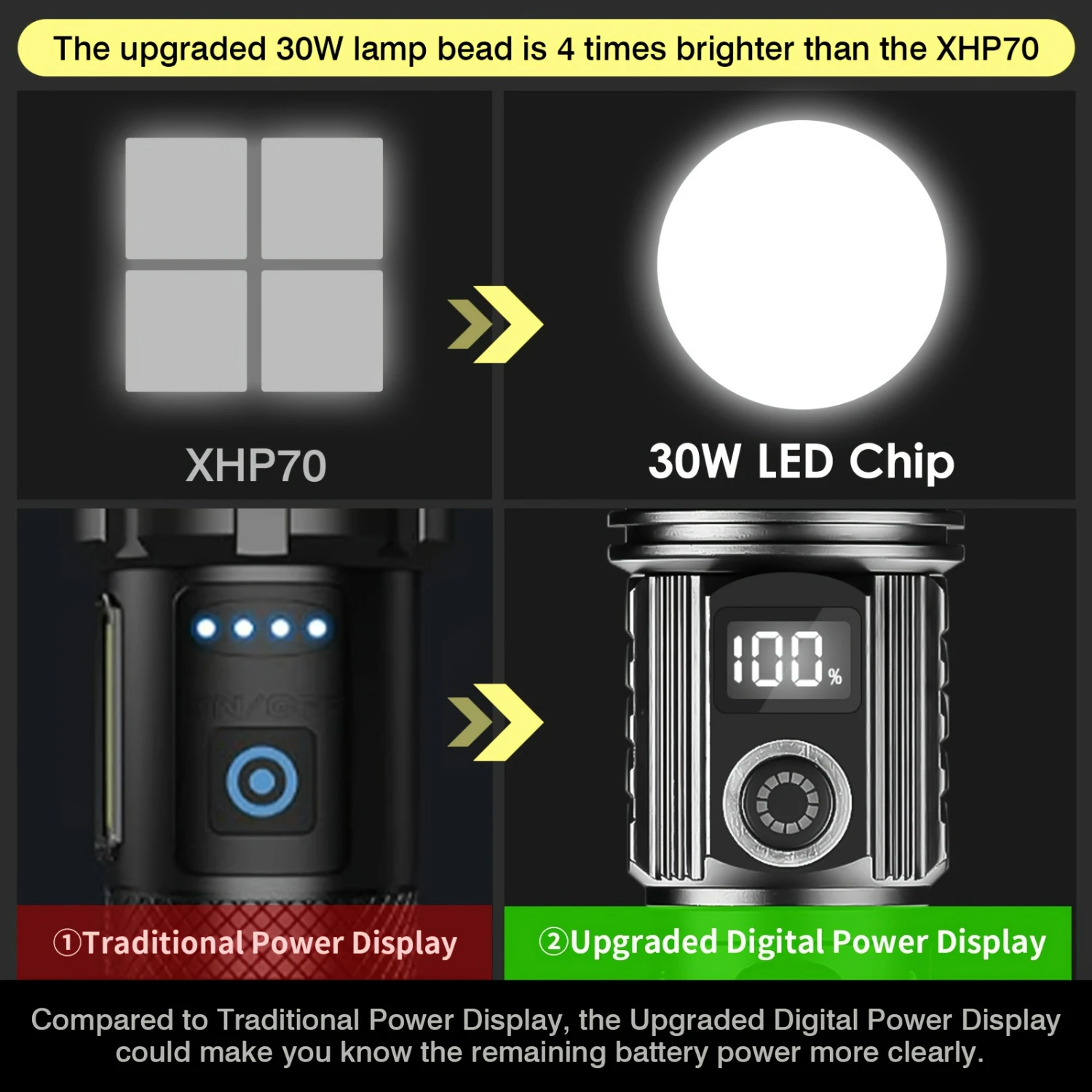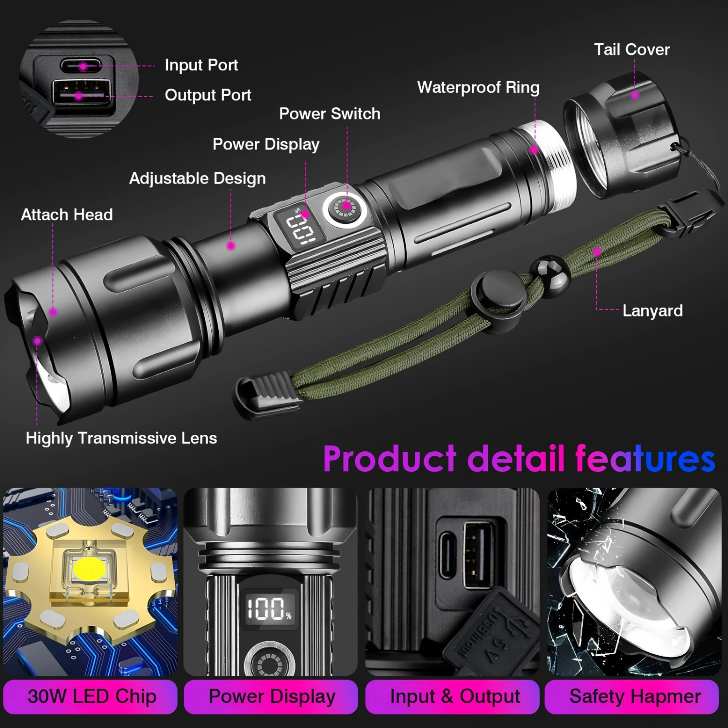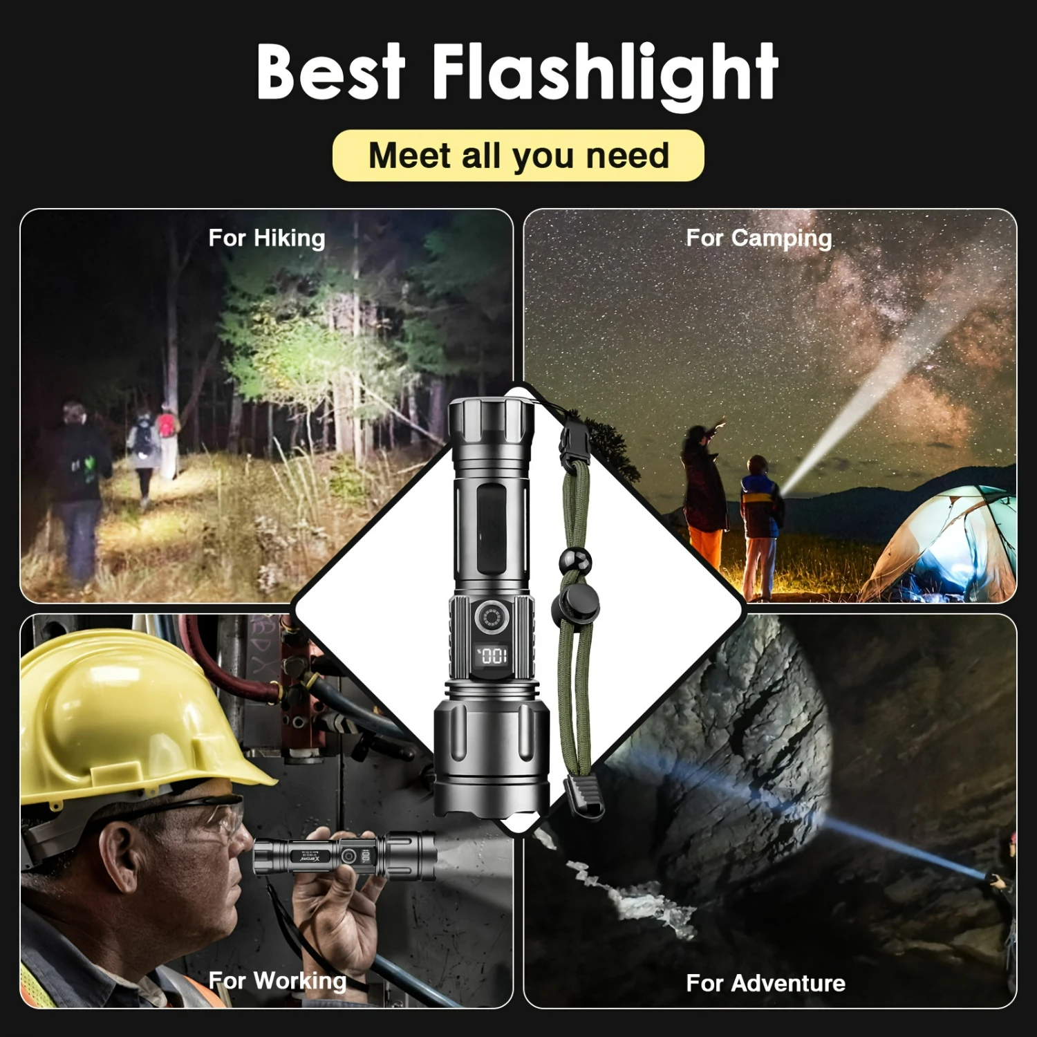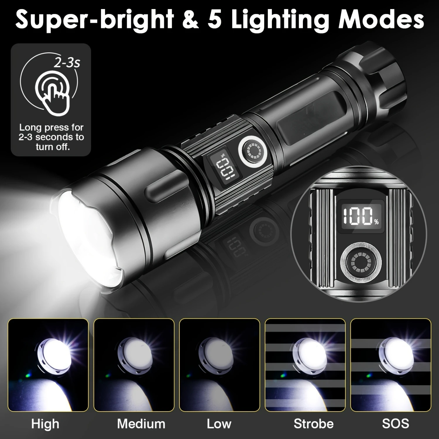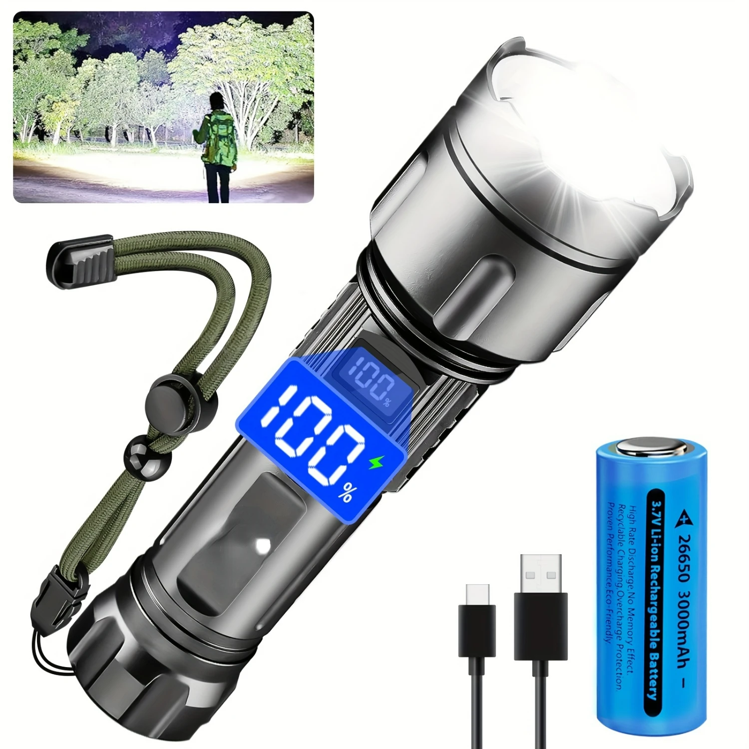 مصباح يدوي LED قوي للغاية مقاوم للماء وقابل لإعادة الشحن عبر USB مع 5 أوضاع وميزة تكبير، يتضمن بطارية 26650 وشاشة عرض طاقة