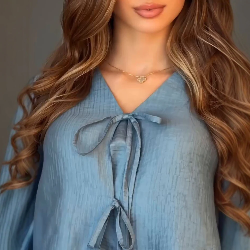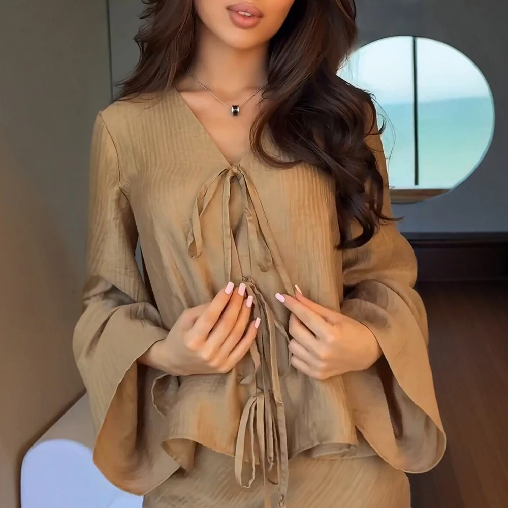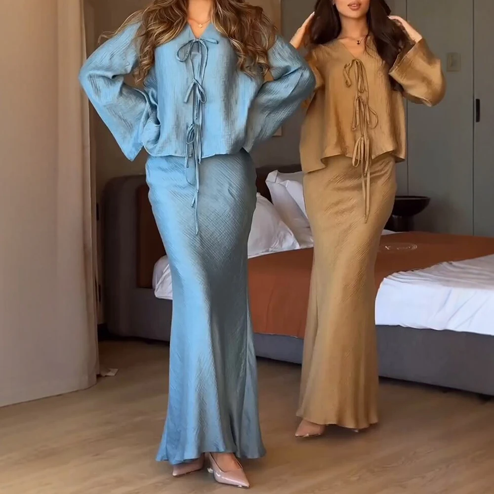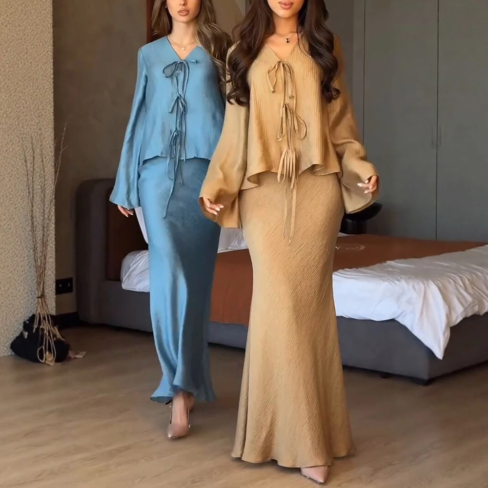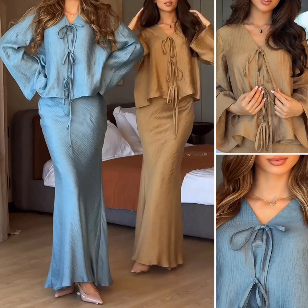 أطقم صيفية من رافيا 2025 أطقم تنورة طويلة أنيقة للسيدات برباط علوي وأكمام طويلة ورقبة على شكل حرف v أطقم غير رسمية