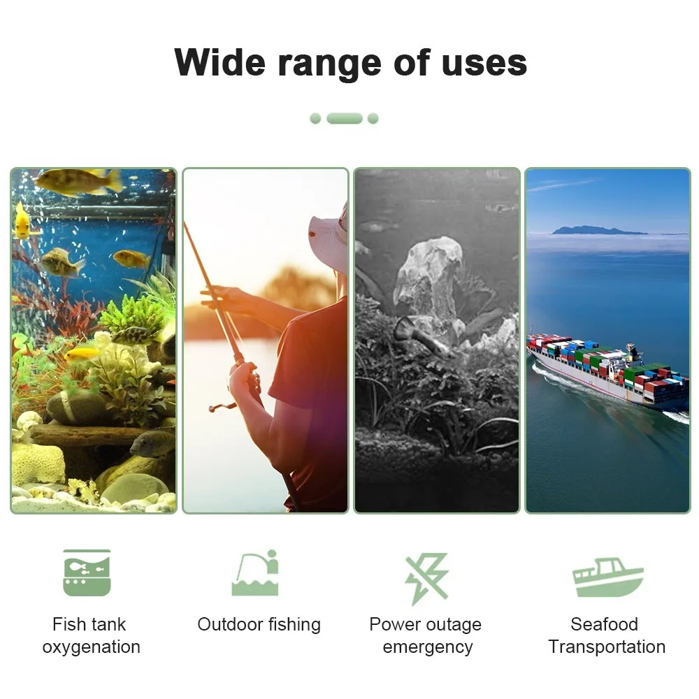 لديها مجموعة واسعة من الاستخدامات، بما في ذلك الأكسجين في خزانات الأسماك، والصيد في الهواء الطلق، ونقل الأسماك، وكضخة أكسجين احتياطية في حالات الطوارئ في حالة انقطاع التيار الكهربائي.إنها مناسبة لكل من المياه العذبة ومياه البحر