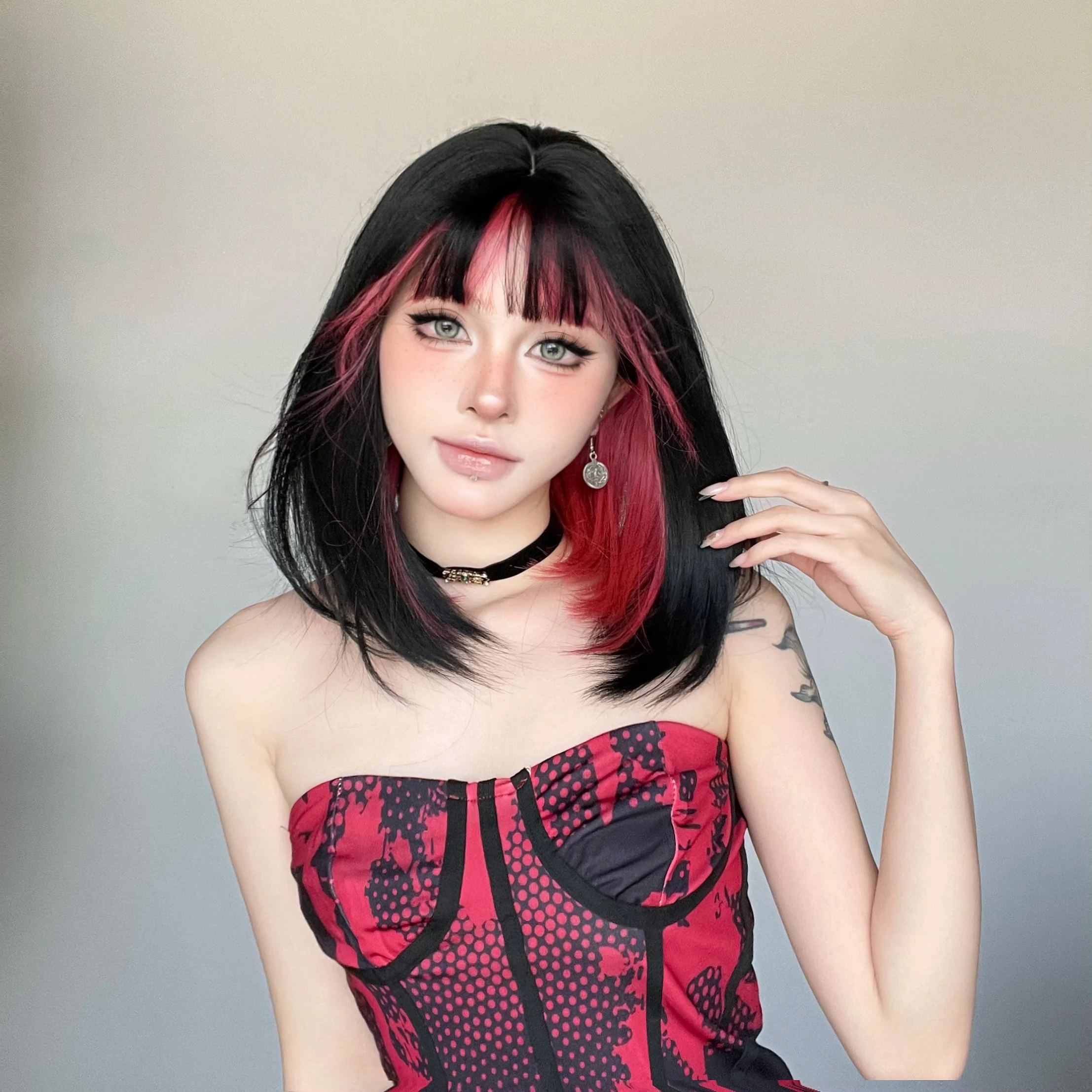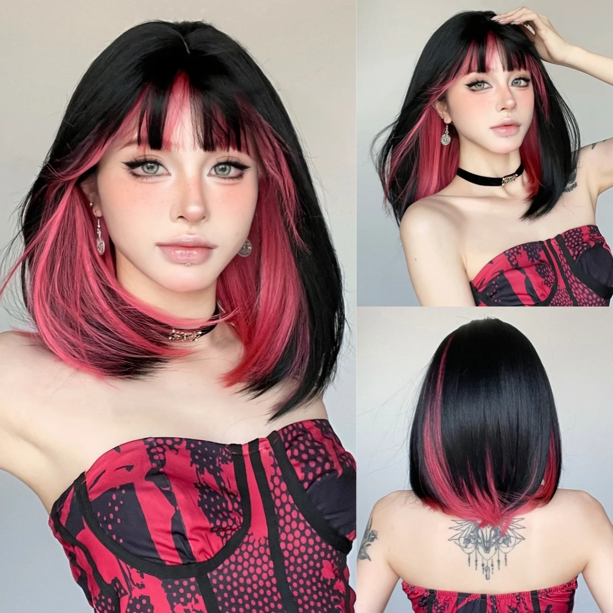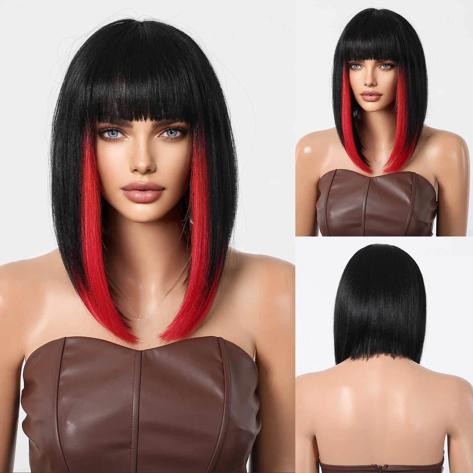 Allbell Magique شعر مستعار قصير مستقيم بوب للمرأة شعر مستعار أسود وأحمر مع الانفجارات تسليط الضوء على الشعر الأحمر شعر مستعار اصطناعي مقاوم للحرارة