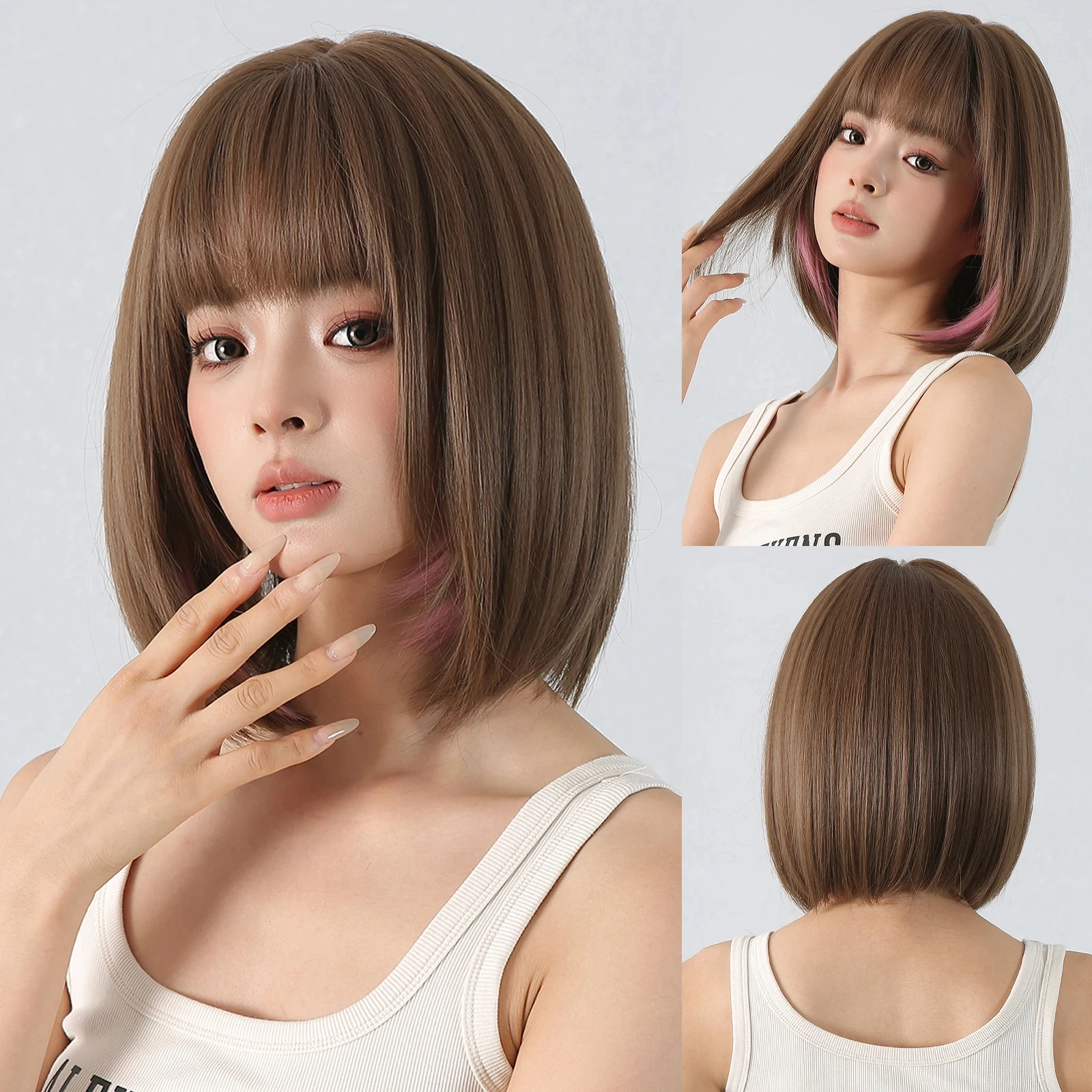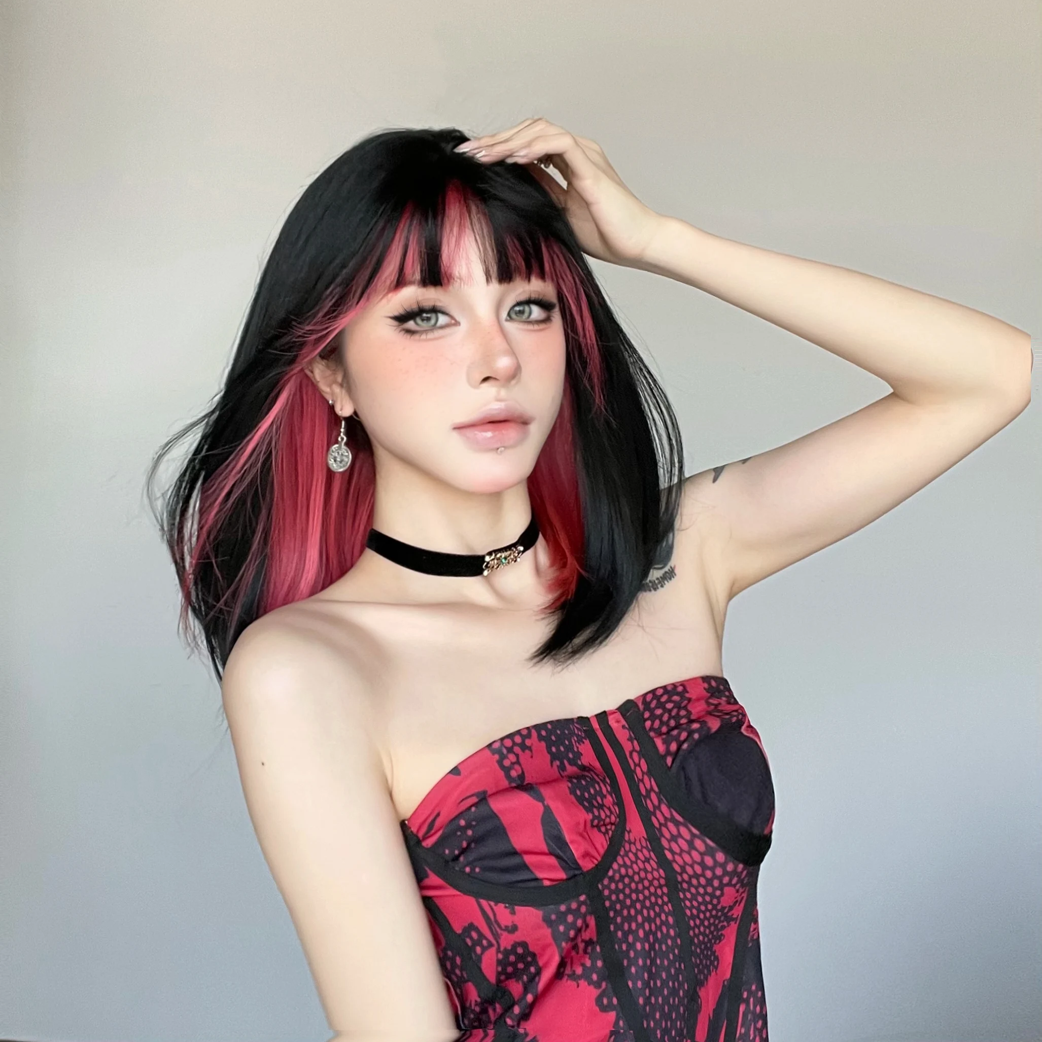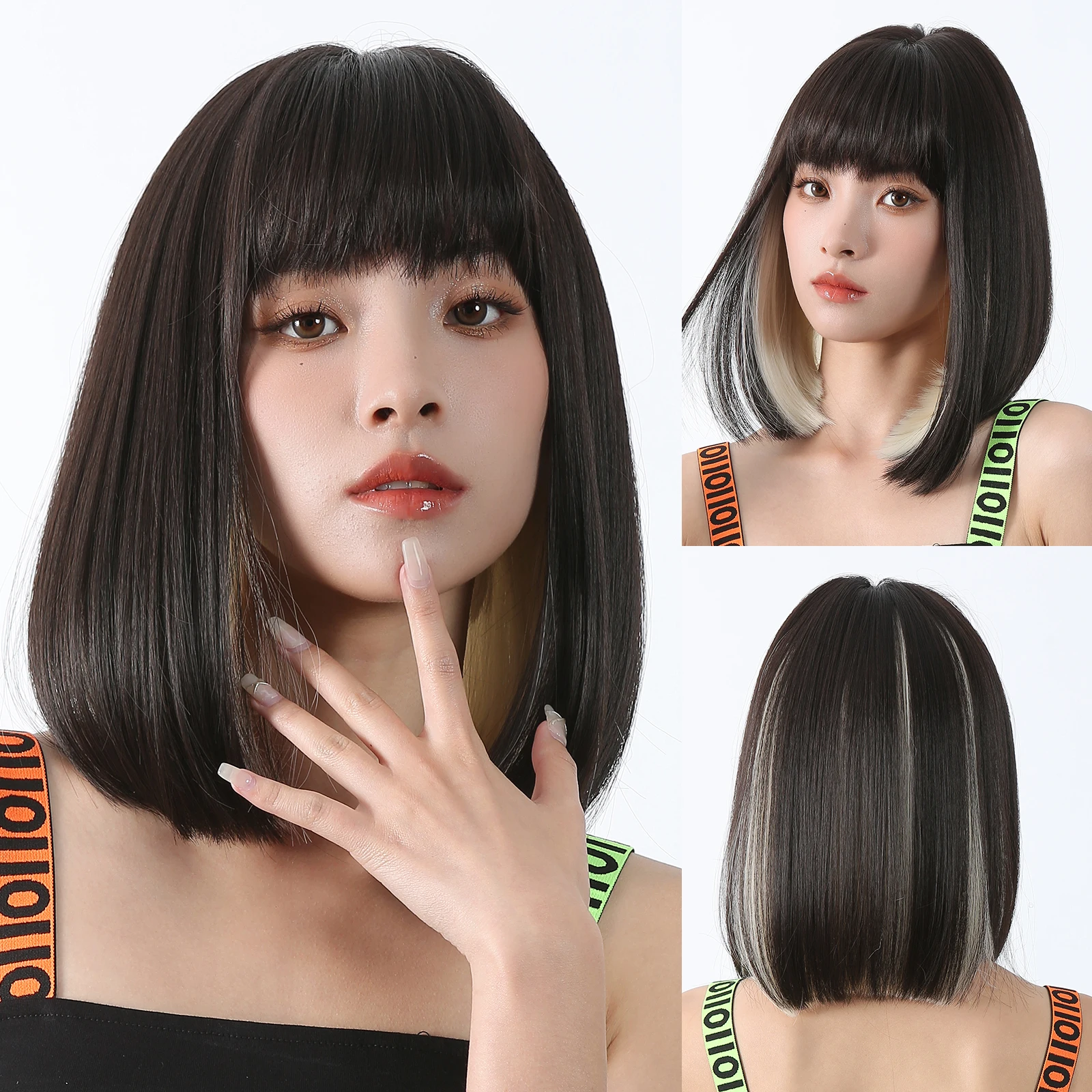 Allbell Magique شعر مستعار قصير مستقيم بوب للمرأة شعر مستعار أسود وأحمر مع الانفجارات تسليط الضوء على الشعر الأحمر شعر مستعار اصطناعي مقاوم للحرارة