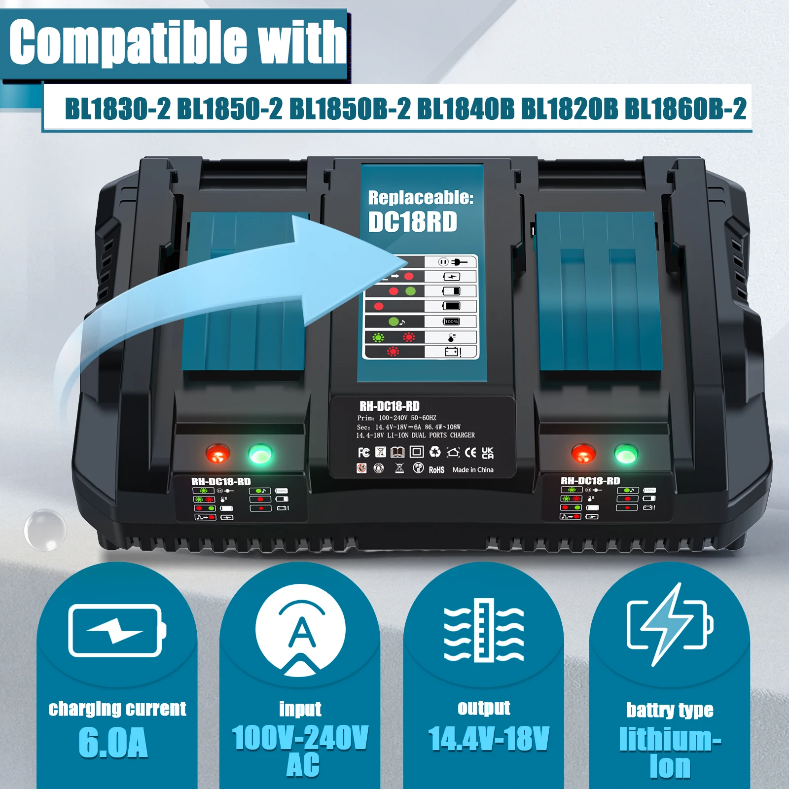 أحدث شاحن بطارية ليثيوم أيون مزدوج 6A تيار الشحن لماكيتا 14.4 فولت 18 فولت BL1830 Bl1430 DC18RC DC18RD شحن سريع