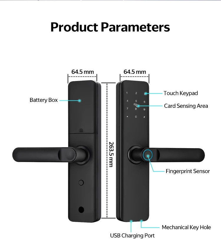 اللوحة الأمامية × 1 اللوحة الخلفية × 1 قفل نقر × 1 مفتاح ميكانيكي × 2 بطاقات المفاتيح: × 5 تعليمات × 1 طقم مسامير × 1