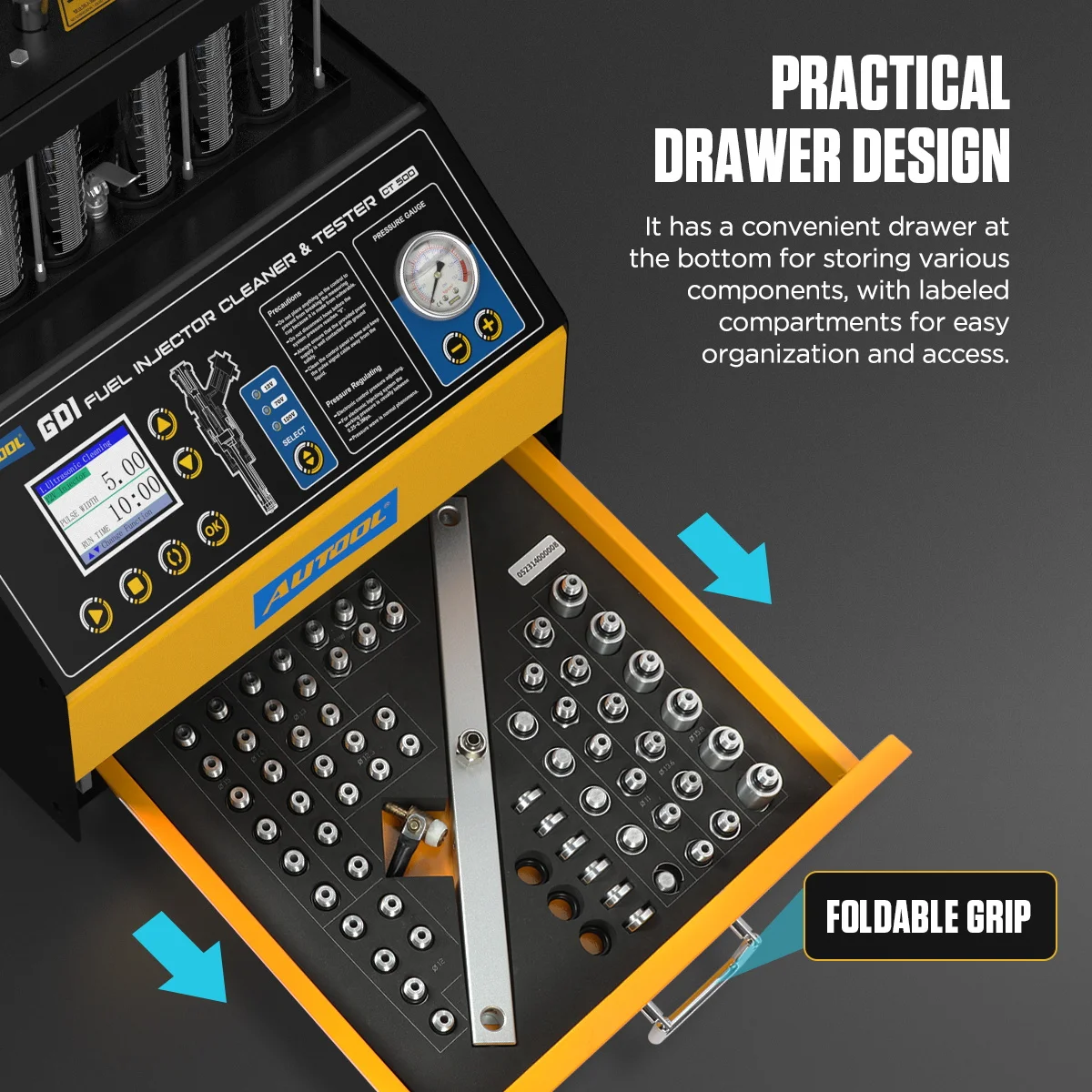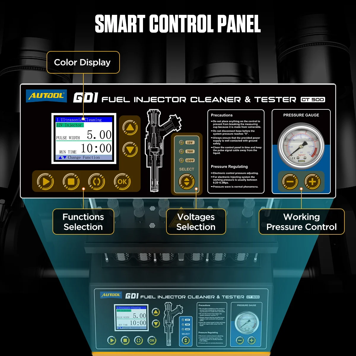 In view of the increasing maturity and use of the Gasoline direct injection, AUTOOL has released the CT500 GDI Injector Cleaner and Tester machine in 2023. Gasoline direct injection is a technology that injects fuel directly into the cylinder and mixes it with the intake air. Compared to conventional injectors, the use of GDI can help improve engine efficiency and specific power output as well as reduce exhaust emissions. CT500 not only supports GDI, EFI, FSI and other types of fuel injectors, but also compatible with common standard fuel injectors. The CT500 is available in three voltages to drive the GDI injectors, 12V, 70V and 120V, which basically covers the injectors of the majority vehicle brands in Europe, America and Asia.