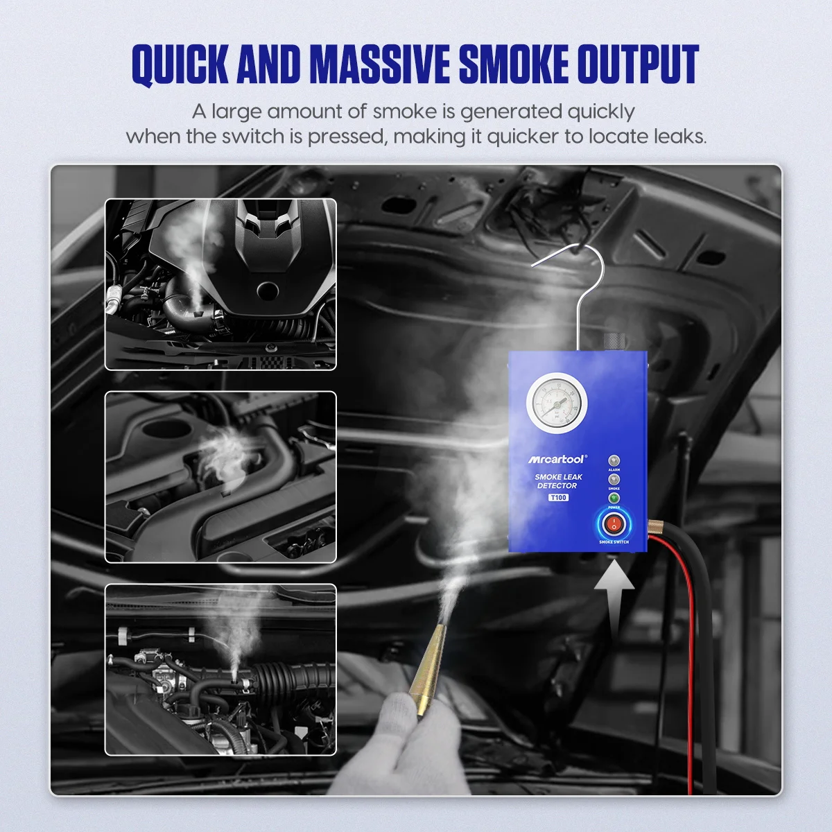 2.[قوي وسهل التشغيل] يحتوي MR CARTOOL T100 على مضخة هواء خاصة به، ولا يعتمد على آلة هواء أخرى، قم بتوصيل الكاشف ببطارية DC12V، ويمكن إخراج الكثير من الدخان في غضون 30 ثانية بعد التشغيل.