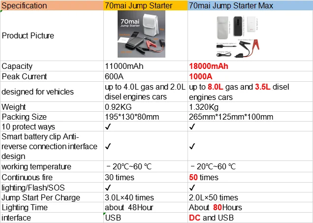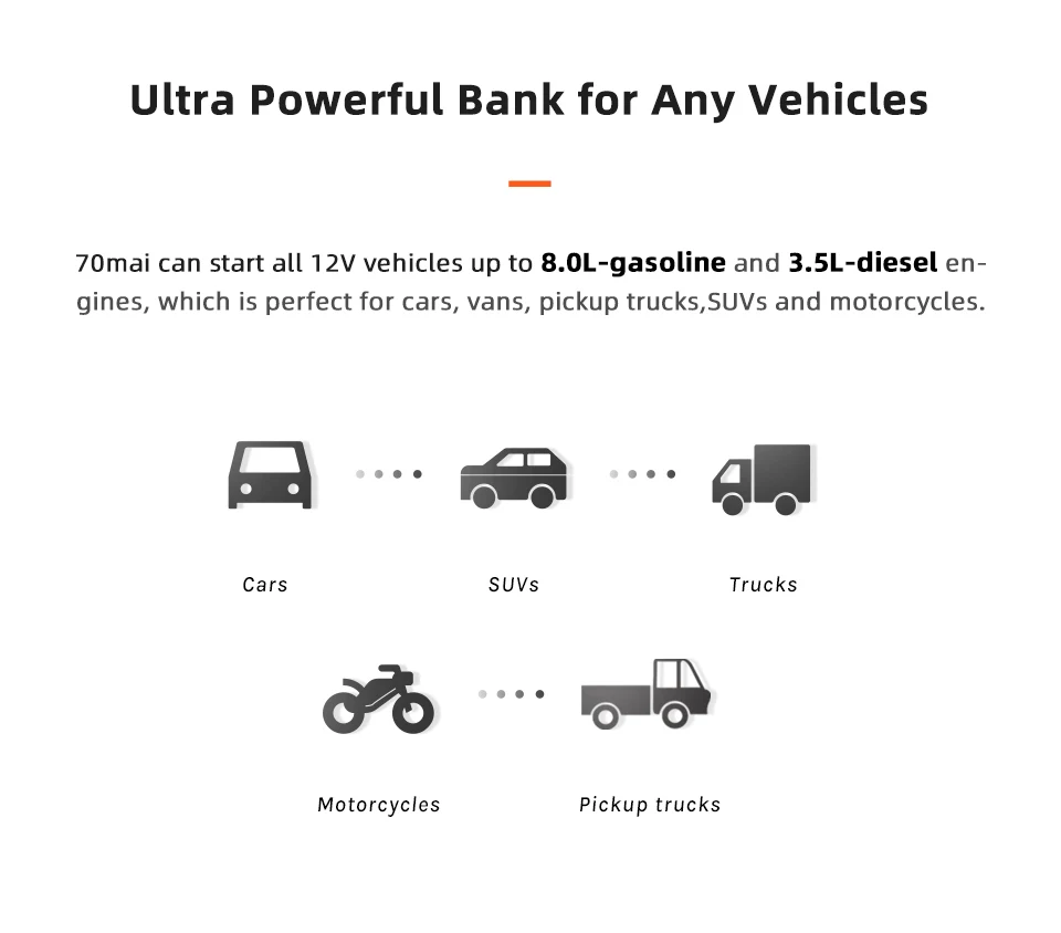 يمكن لـ 70mai تشغيل جميع المركبات 12 فولت حتى 8.0 لتر بنزين ومحركات ديزل 3.5 لتر، وهو مثالي للسيارات والشاحنات الصغيرة وسيارات الدفع الرباعي والدراجات النارية.