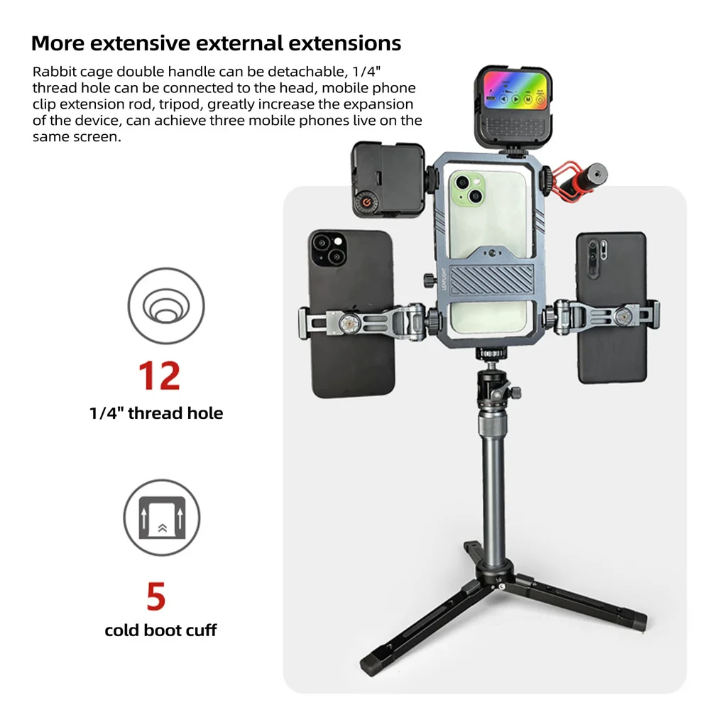 With 12 standard 1/4'' threaded holes and 5 cold shoe ports, this phone cage offers abundant external expansion options