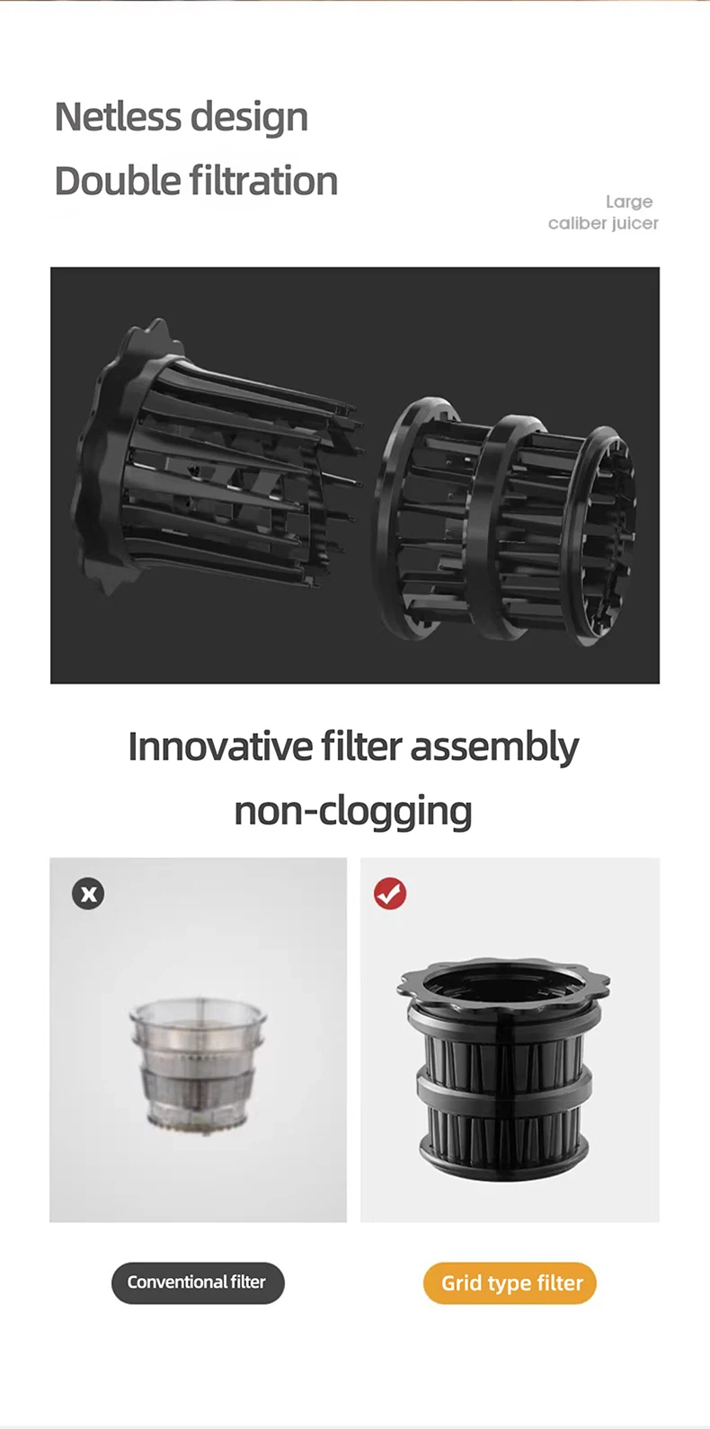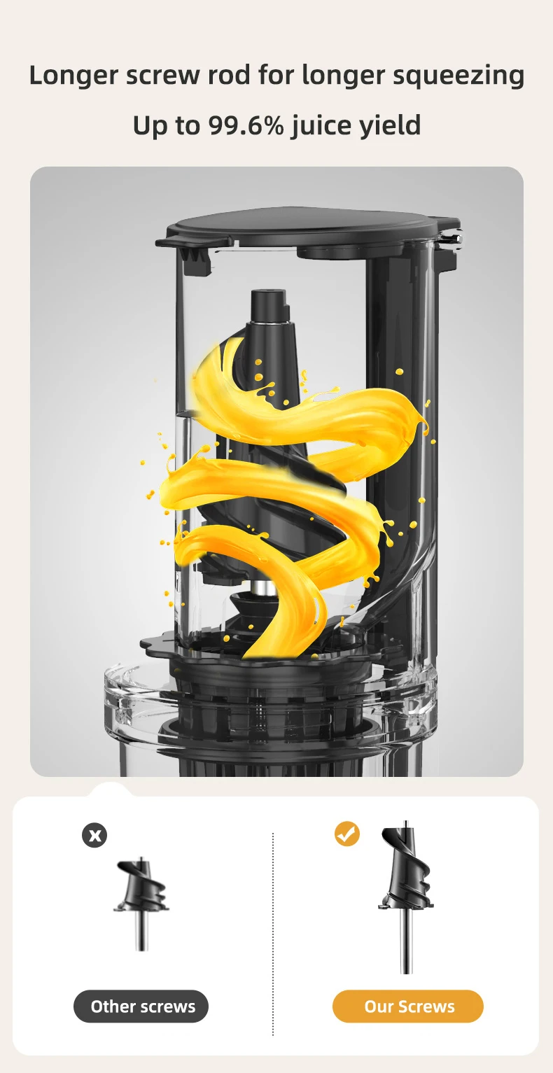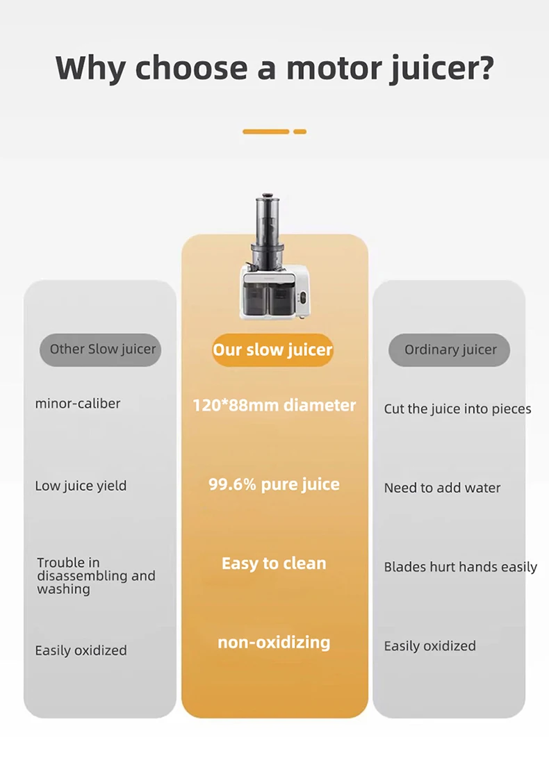 * اعتماد الضغط بطيء حلزوني ، باستخدام عملية القطع والسحق والطحن والضغط والضغط للضغط على العصير وإخراج الثمالة ، بحيث يكون العصير نقيًا وأصليًا دون طعم الثمالة.