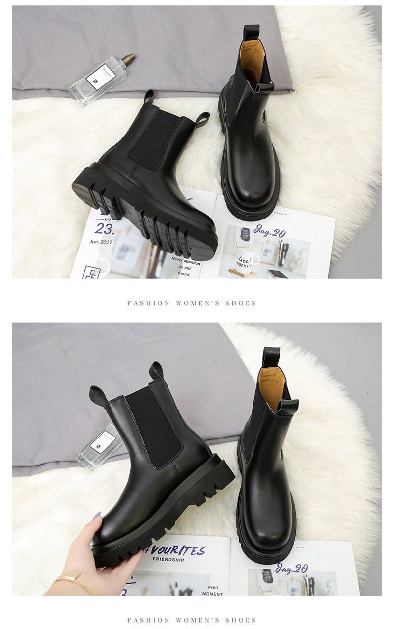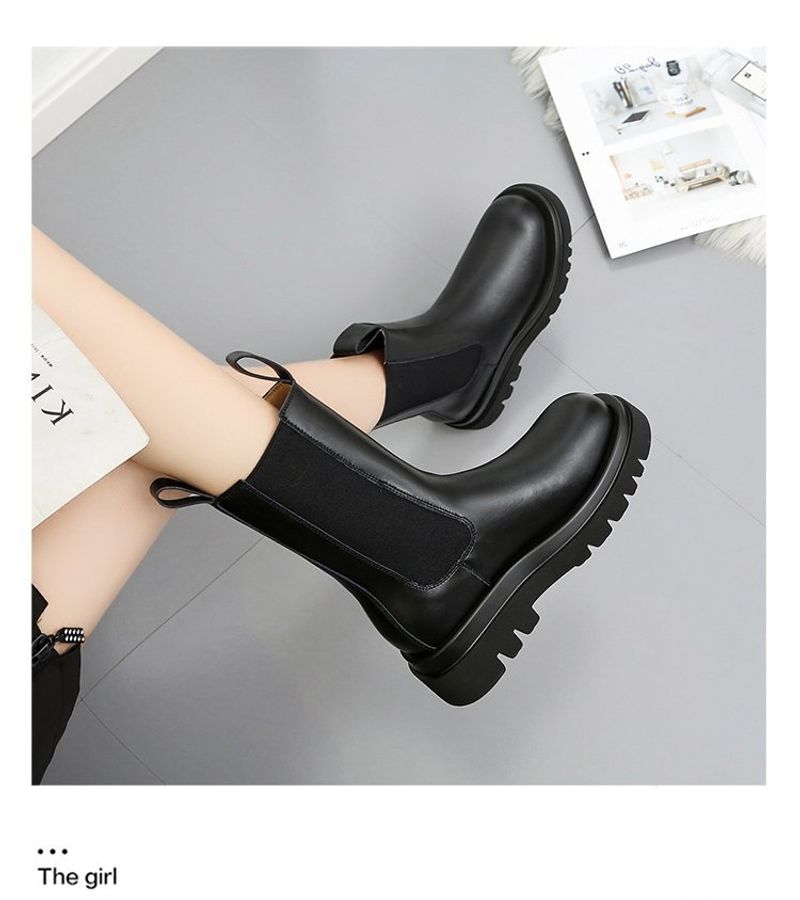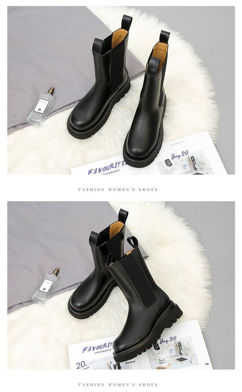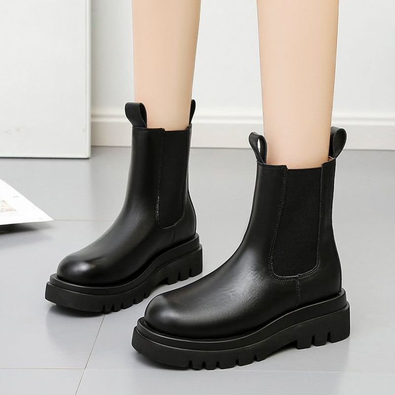 أحذية جلدية للنساء ذات رأس دائري ونعل سميك يصل إلى منتصف الساق موديل أنيق أحذية نسائية