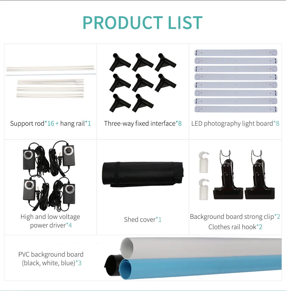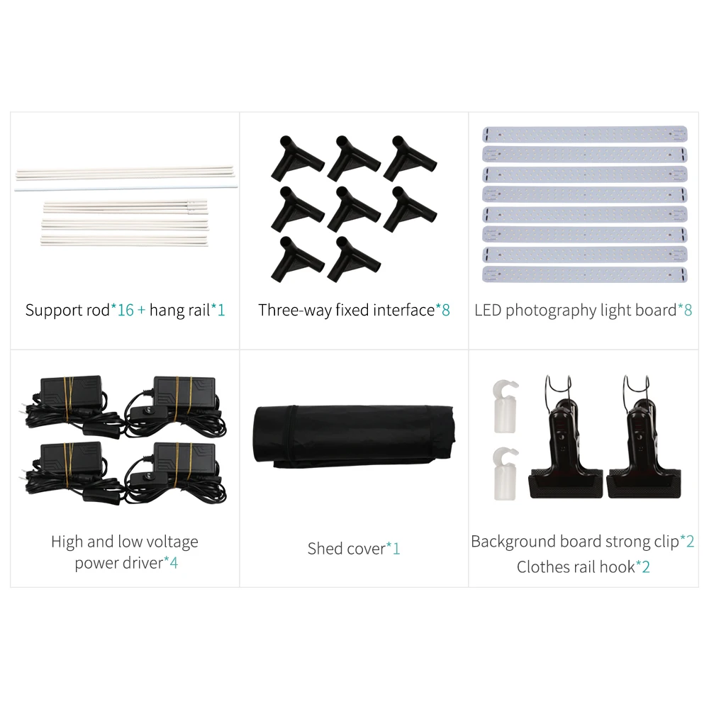 قضيب دعم * 16 + قضيب تعليق * 1 + واجهة ثابتة ثلاثية الاتجاه * 8 + لوحة إضاءة ليد للتصوير * 8 + سائق فولتاجيبوير عالي و...