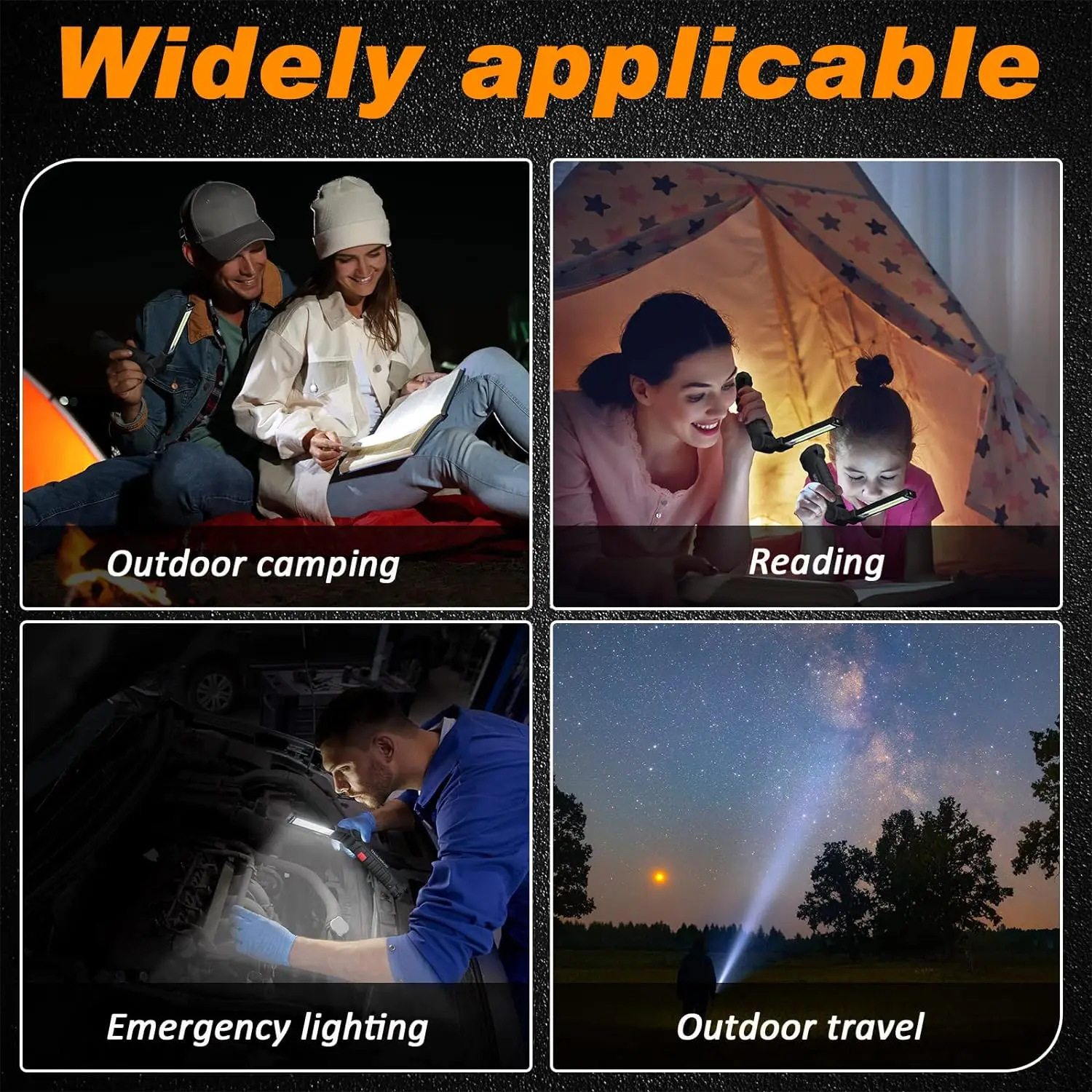 يمكن استخدام مصابيح العمل المصنوعة جيدًا لصيانة السيارات، وإضاءة المنزل، وانقطاع التيار الكهربائي، وإضاءة الطوارئ، والسفر، والتخييم، والمشي لمسافات طويلة، إلخ.