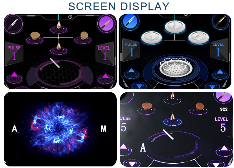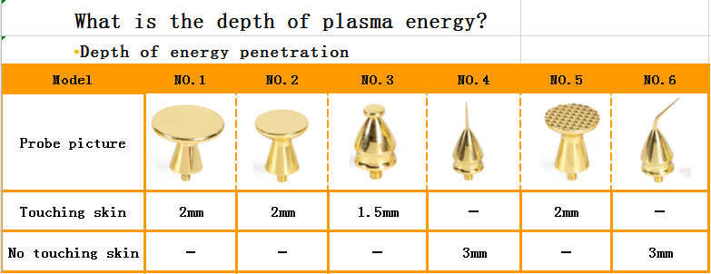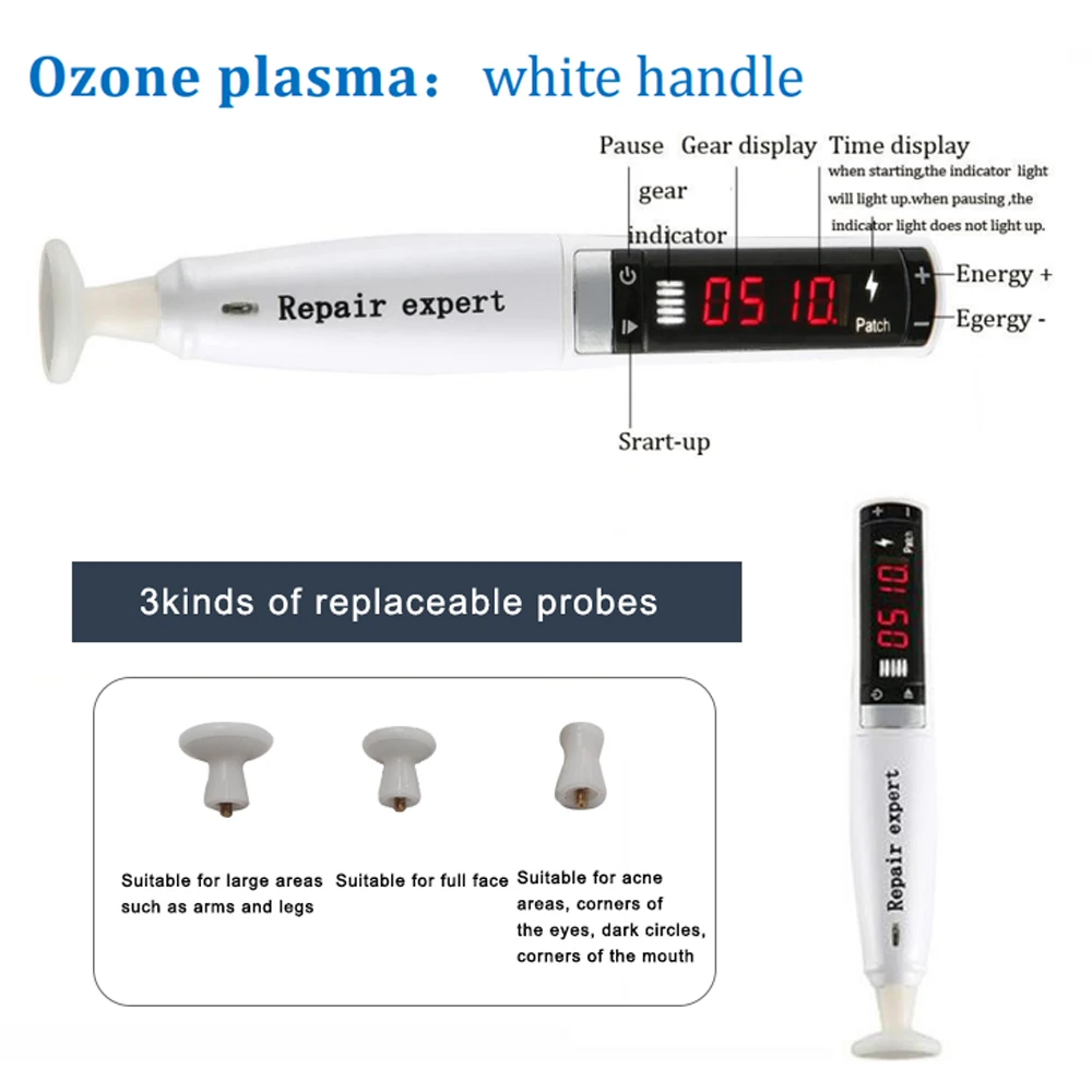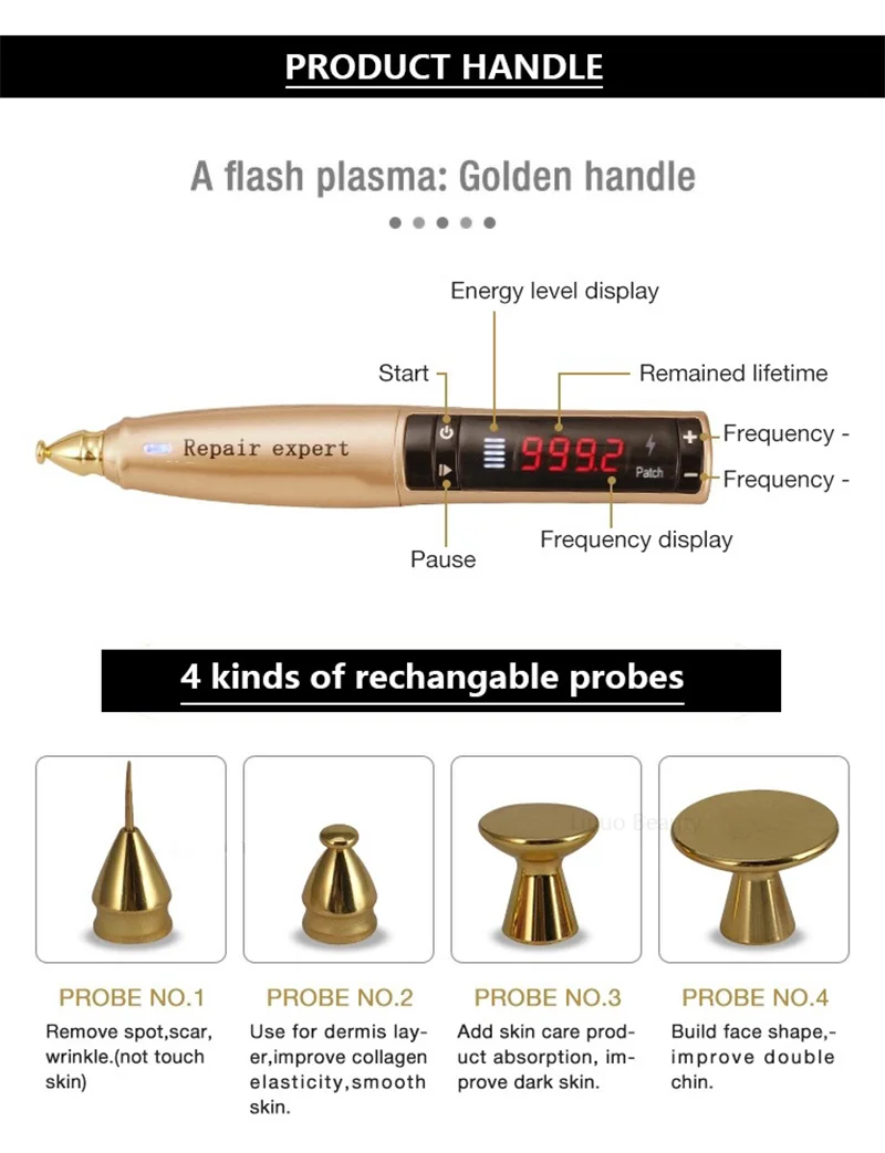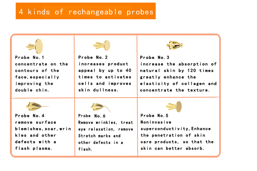 شرارة البلازما (مقبض ذهبي): شد الوجه، وشد الوجه، والنمش، والتجاعيد، وعلاج أقدام الغراب.بلازما الأوزون (مقبض أبيض): تعقيم مضاد للالتهابات، مهدئ وحكة، أصباغ أنابولية، تنظيم إفراز الزيت، التحكم في الزيت وتنظيفه، لحساسية الجلد، حب الشباب، الأكزيما، التهاب الجلد وغيرها من مشاكل الجلد.