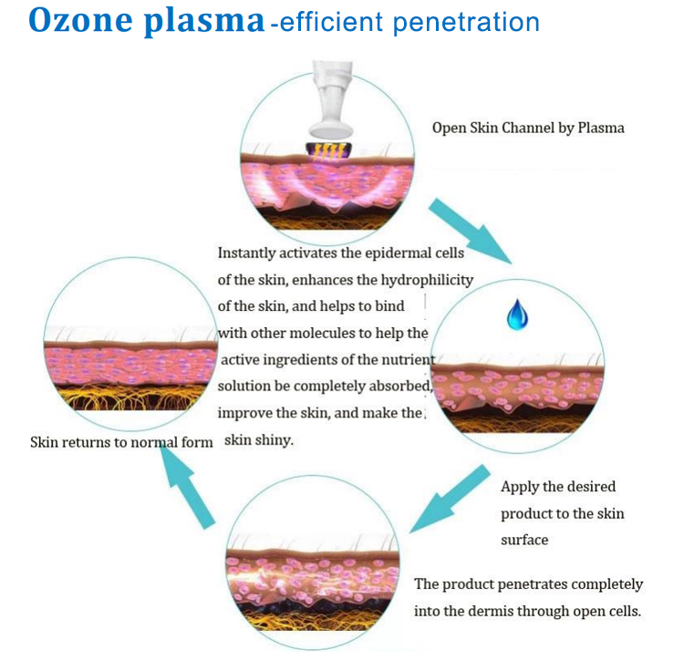 يتم توليد جهد التردد، ويتم تحليل الأكسجين الموجود في الهواء كهربائيًا لتوليد الأوزون.يعمل دور أوزون الأوزون على غشاء الخلية للبكتيريا، مما يسبب ضررًا لمكونات الغشاء، ويدمر البروتينات الدهنية وأوكاسهيدات الدهون في الغشاء، ويغير تحلل الخلايا والموت، وبالتالي قتل الفطريات والبيدان البكتيرية في فترة زمنية قصيرة جدًا، وتمنع الالتهاب، ويكون تأثير حب الشباب واضحًا.يتم تقليل الأوزون إلى الأكسجين بعد التعقيم، ولا يوجد بقايا أو تلوث ثانوي، وهو أمر لا يمكن تحقيقه بواسطة أي نظام كيميائي.مستقبل وفوائد بلازما الأوزون يمكن استخدام مقياس الأوزون البلازما في جميع الأجزاء.لم يكن لدى البشرة أي جروح بعد تشغيل أداة الأوزون البلازما.تجديد الجلد بعد عملية الأوزون في البلازما.يتم إنتاج كولاجين جديد على الأدمة بعد عملية الأوزون في البلازما.تصبح مرونة الجلد بعد تشغيل مقياس الأوزون البلازما أفضل بسبب إنتاج الكولاجين الجديد.لا يوجد ألم، لا ندبات، لا نزيف، لا جروح، عملية غير جراحية، عملية أكثر ملاءمة، أكثر أمانًا وفعالية.