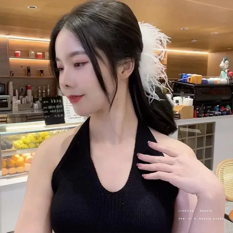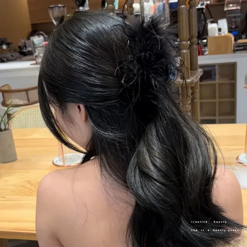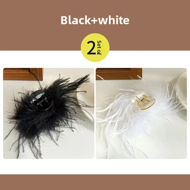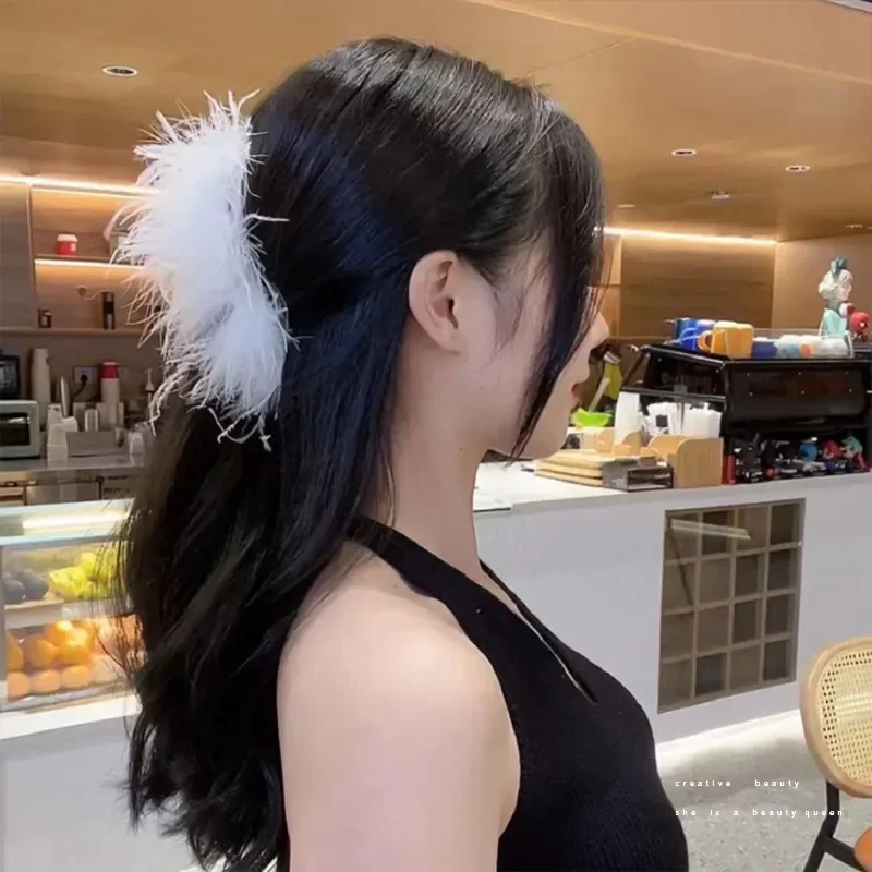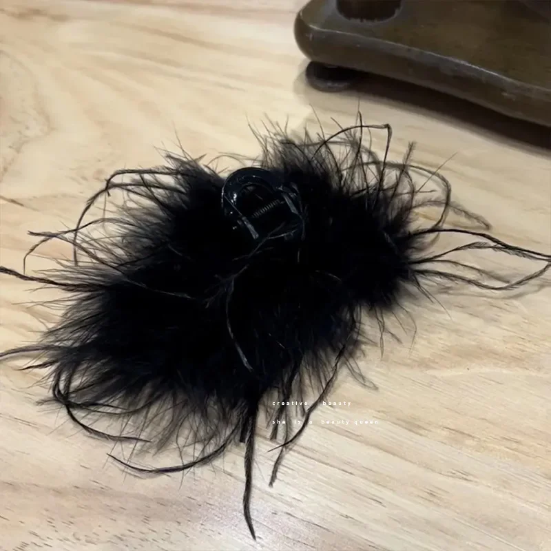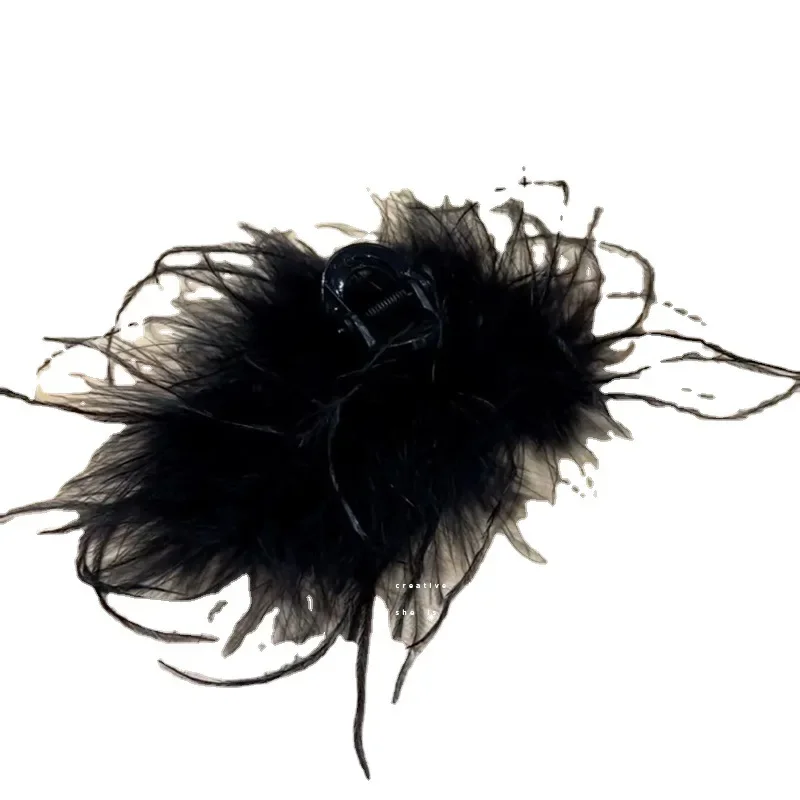 مشبك شعر أنيق كبير من ريش النعام الأسود للنساء لخريف وشتاء الجزء الخلفي من الرأس وحامل ذيل حصان ومشبك قرش وإكسسوارات عصرية