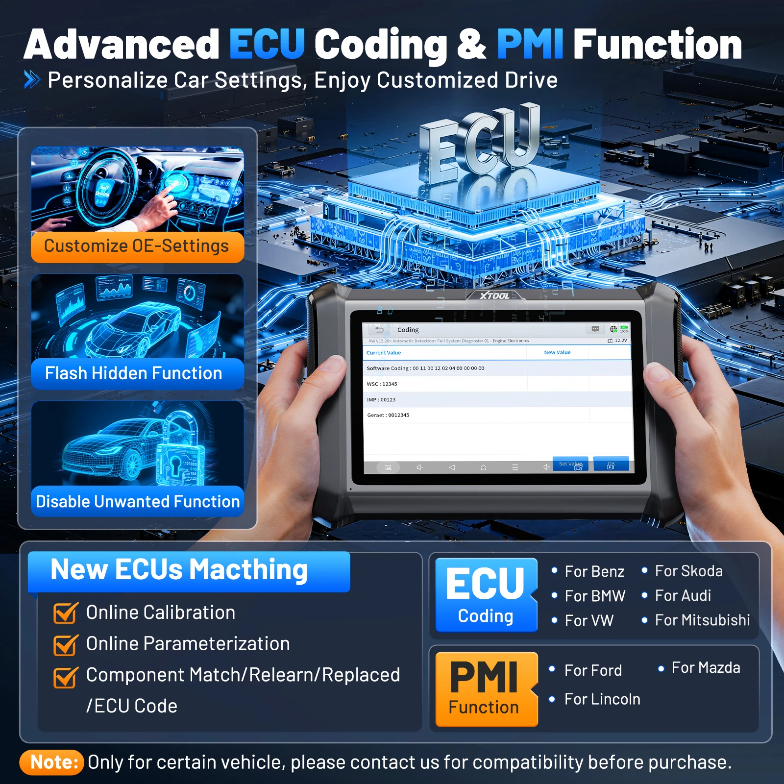أداة تشخيص السيارة XTOOL D7S، تتفوق في ترميز وحدة التحكم الإلكترونية لشركة فولكس فاجن وأودي وسكودا وبنز ولميتسوبيشي سيارات محددة (ليست عالمية).وهو يدعم الترميز دون اتصال بالإنترنت، ومطابقة المكونات، وإعادة ضبط البيانات التكيفية، للمساعدة في تحسين أداء السيارة وتخصيص إعدادات السيارة، ويوفر الحل بعد استبدال الوحدة أو المكونات.