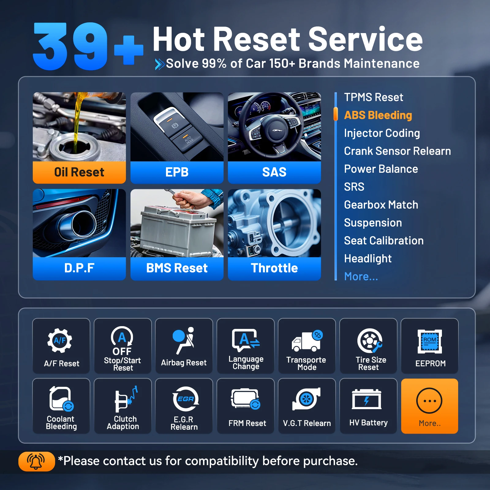 يشمل أيضا:إعادة ضبط BMS، تعديل المصباح الأمامي، مطابقة علبة التروس، تعلم التروس، تعليق هوائي، تهيئة Windows، مطابقة المقعد، توازن الطاقة، ترقية الإطارات، تعطيل وضع النقل، إعادة ضبط A/F، المضخة الإلكترونية، محول EEPROM، إعادة ضبط الإيقاف/البدء، تغيير اللغة، إعادة ضبط وحدة التحكم، مستشعر المطر/الضوء، إعادة تعلم مكيف الهواء، بطارية HV، إعادة تع