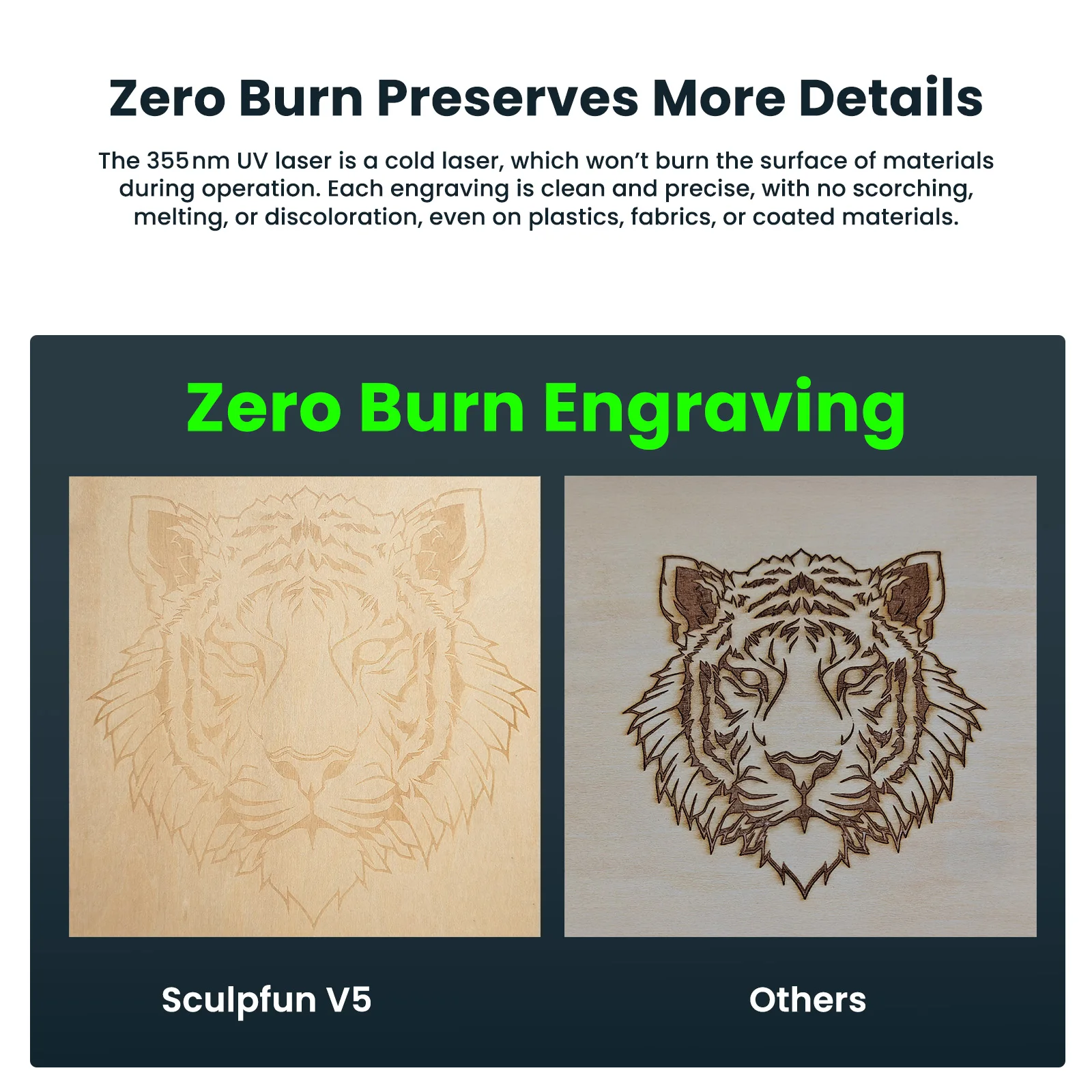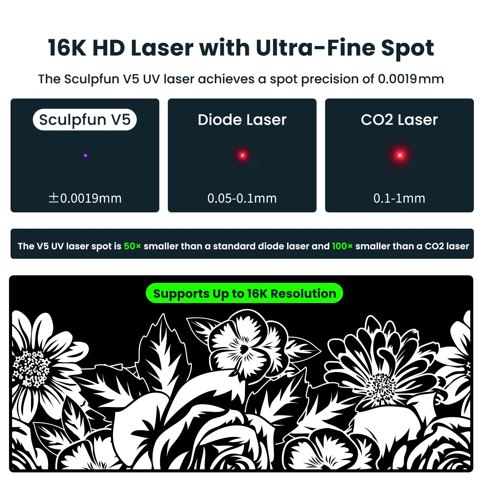 حفارة ليزر SCULPFUN V5 UV بقدرة 5 وات مع عدستين ميدانيتين اختياريتين 150 مم/70 مم تدعم الرفع الكهربائي المتوافق مع LightBurn لجميع المواد تقريبًا