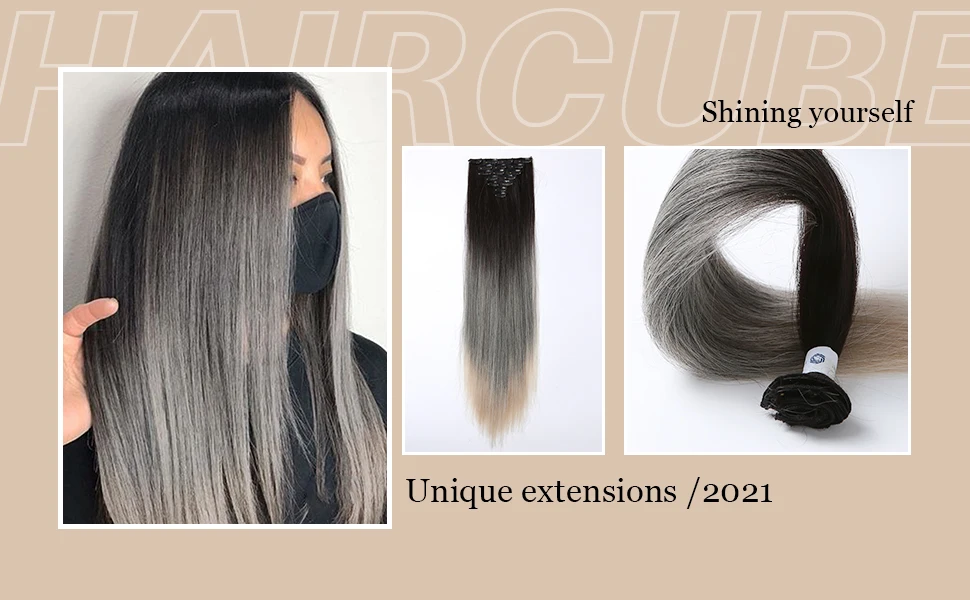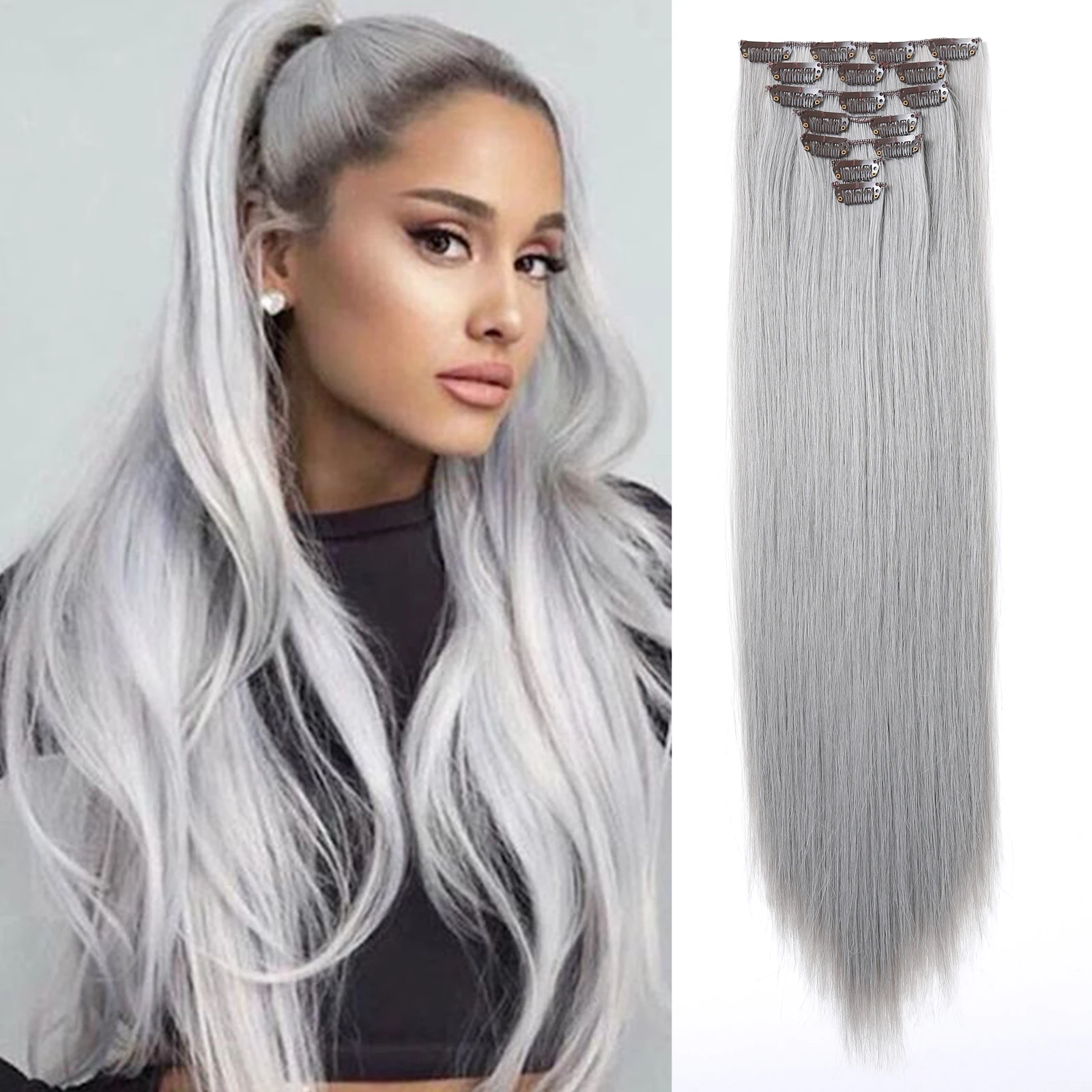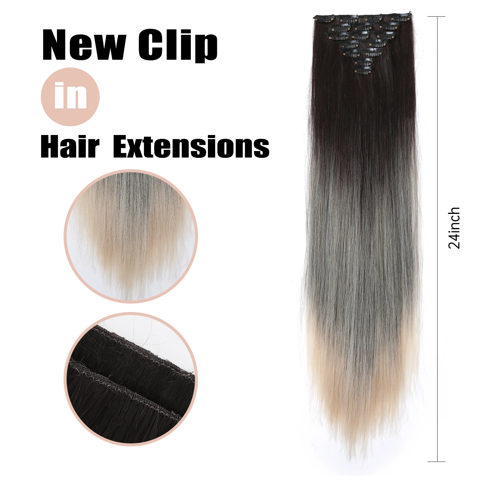7 قطعة/المجموعة فضي أسود أومبير رمادي أصفر مشبك شعر الاصطناعية في قطع الشعر الطويلة مستقيمة سميكة للنساء وصلات شعر تأثيري