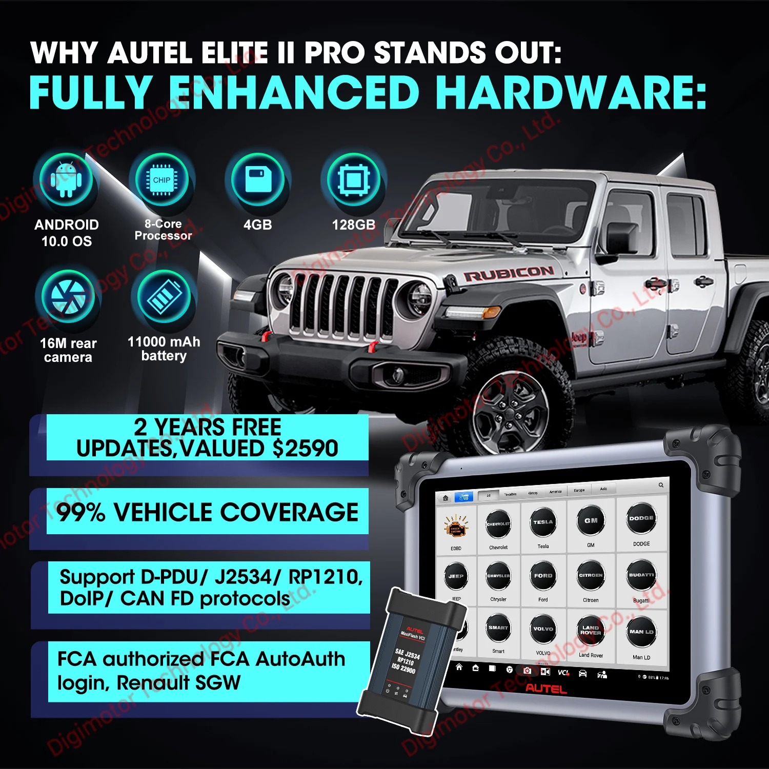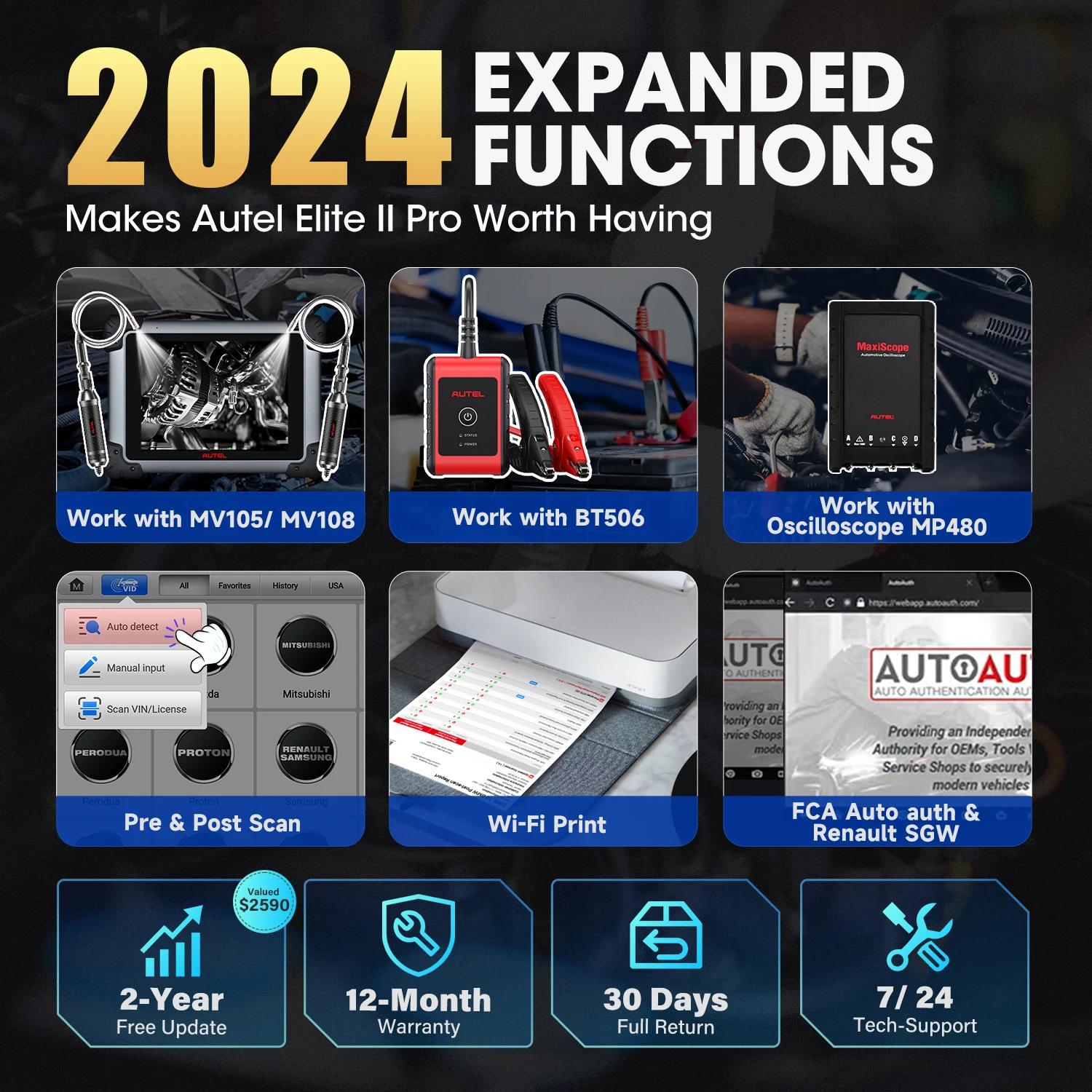 The 2025 recent added functions of Autel scanner Elite 2: ➊Wider Car Coverage with CANFD & DoIP, 150+ Brands Including Tesla, McLaren ➋5X Faster Diagnostics with updated MaxiFlash VCI, Android 10, Auto Scan 2.0 ➌OE-Level All Systems Diagnosis same as Ultra ➍J2534 Programming & Coding ➎40+ Service, All System Diagnosis ➏3000+Active Test ➐Refresh Hidden Features ➑Component Match & VAG Guided ➒2 Years Free Update. Autel Elite 2 is absolutely an ideal solution for car repairs.