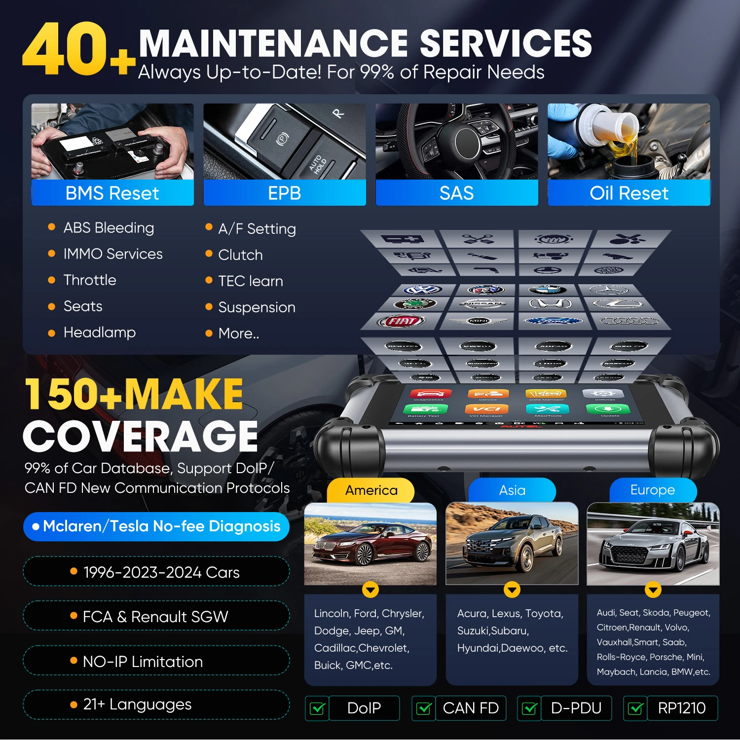 Autel MaxiSys Elite II PRO has 40+ services: Oil Reset, EPB, SAS, A/F Setting, Throt-tle, Suspension, Headlamp, Injector Coding, Power Balance, BMS Reset etc.