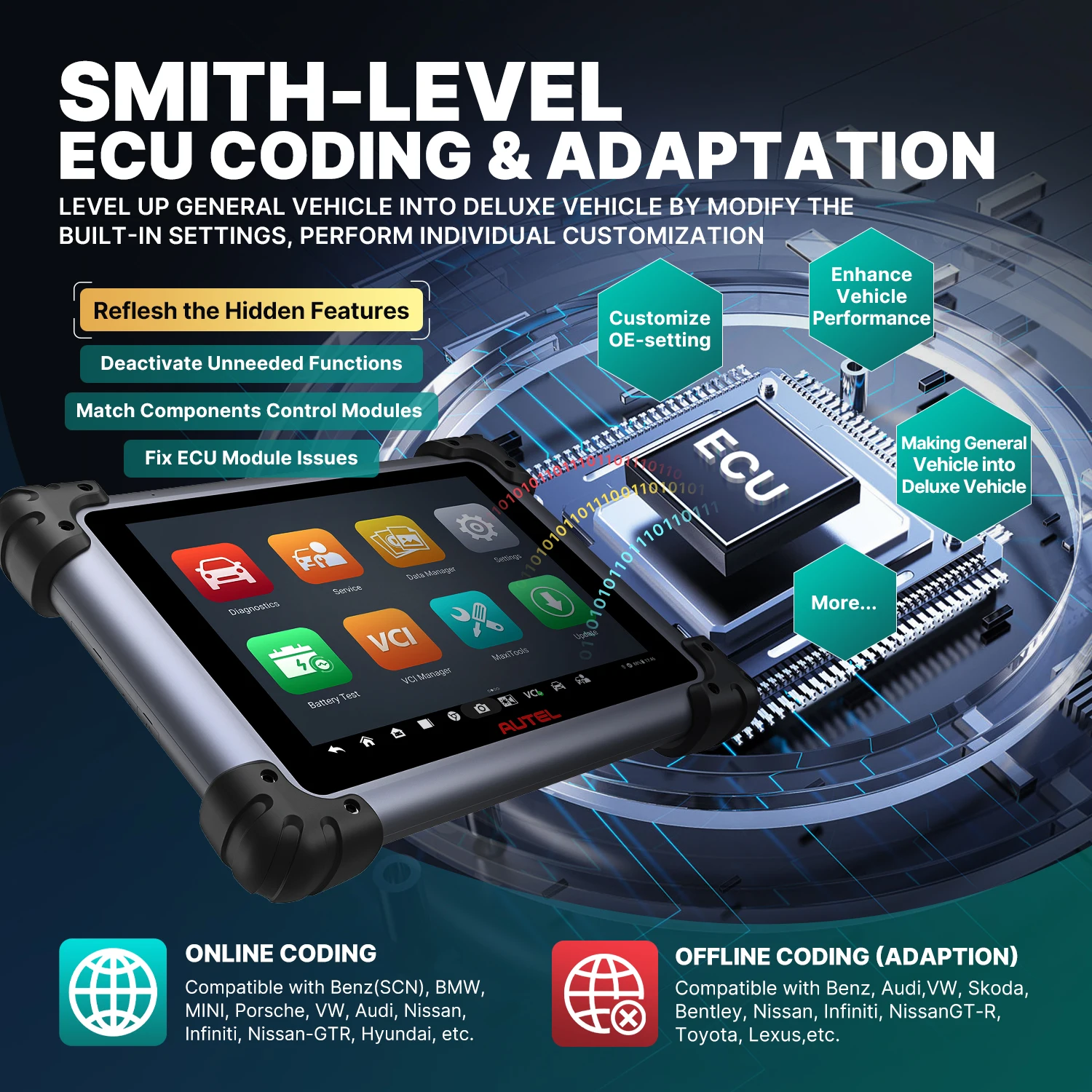 👍Advanced ECU coding: Autel Elite II PRO with advanced ECU coding functions, even if without dealer scanner, you can get OE-level capacities. You are allowed to refresh modules like ECM, TCM, BCM etc for BMW/ BENZ/VW/ AUDI/ SKODA etc. You can also disable useless functions, get advanced functions. Autel Elite can directly pass-thru the gateway to access data for coding to improve vehicle fuel efficiency, reduce power loss, improve the durability of mechanical parts.