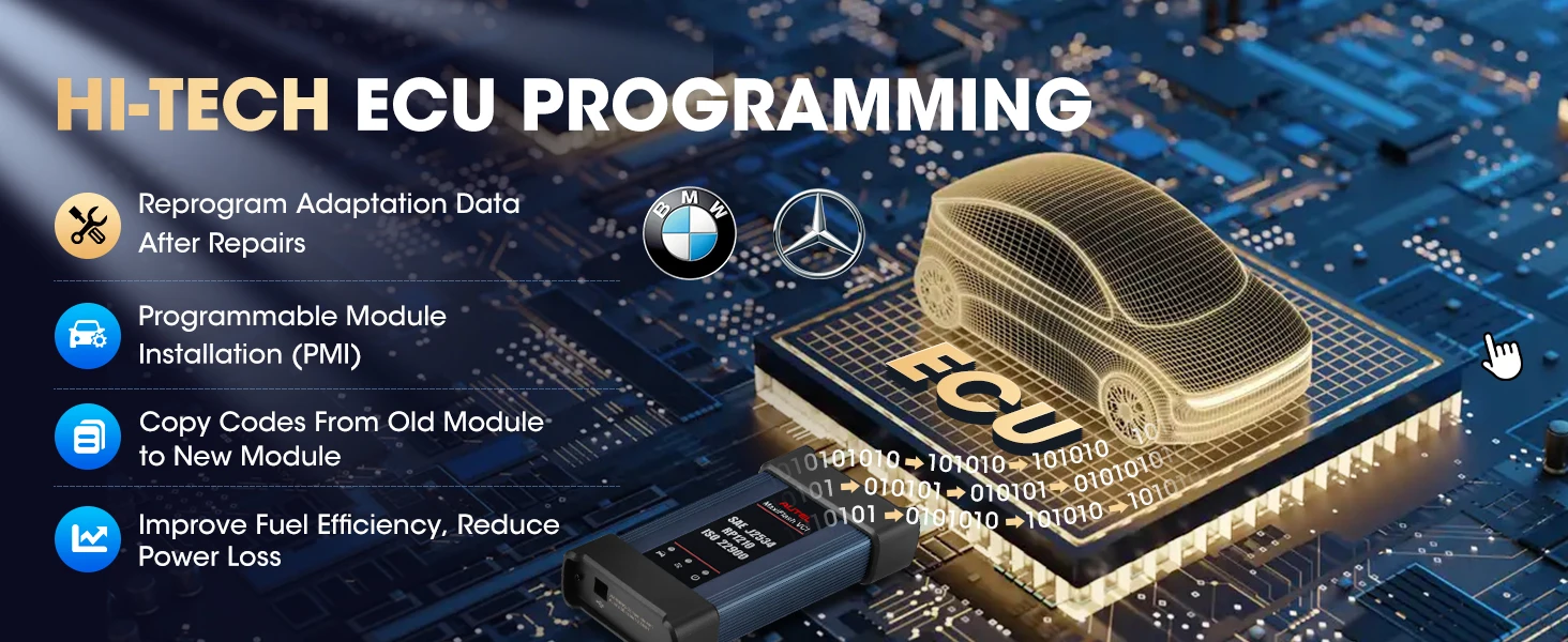Taking your business to a new height. Empower MaxiSys Elite Ⅱ J2534 programming tool to 1) program the new adaptive data to the on-board modules; 2) replace the existing software/firmware in the ECUs; 3) match the component control modules after repair or replacement; 4) flash the hidden functions and 5) enhance the vehicle performance. Online ECU programming for Benz/BMW ONLY.