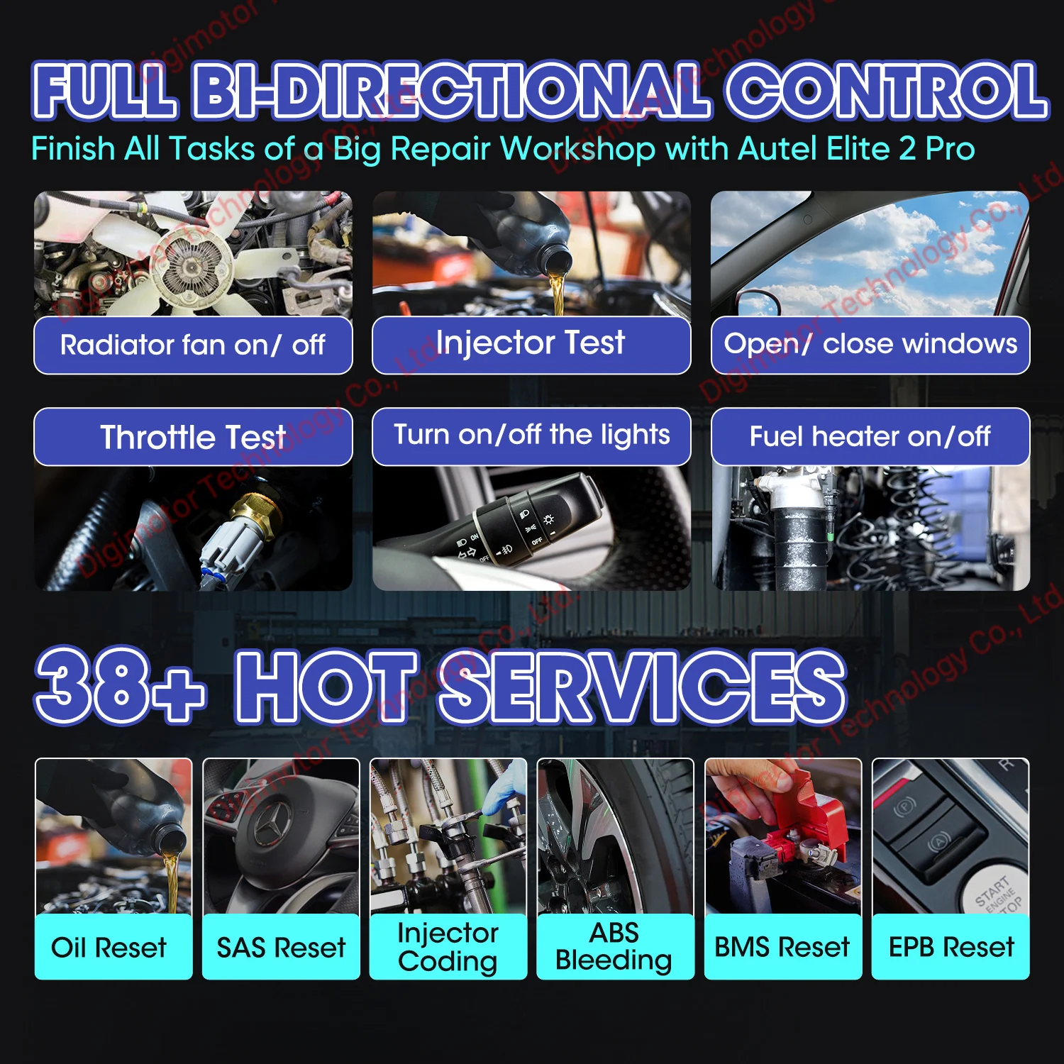 【40+Service & Active Test】Elite II PRO has 40+ services: Oil Reset, EPB, SAS, A/F Setting, Throt-tle, Suspension, Headlamp, IMM-O Keys, Injector Coding, Power Balance, BMS Reset etc. Bi-directional Scanner Autel Elite 2 PRO can transmit command to ECUs and perform actua-tor tests like Cooling Fan, A/C Clutch On/Off, Compression Test, ABS Motor Pump, Windows/Wipers/Sunroof/ Doors Test, Personalized etc.