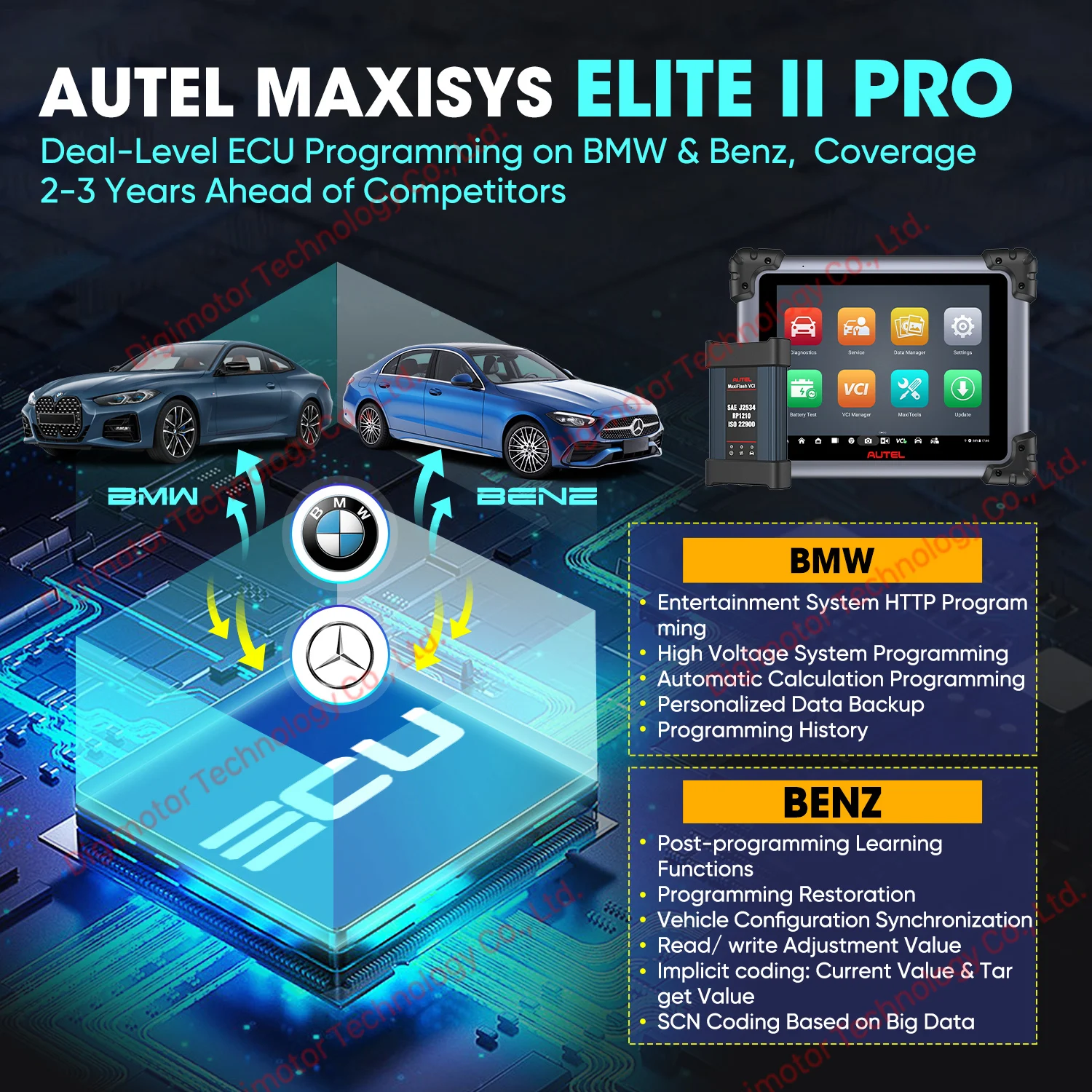 【ECU programming FOR BENZ & BMW】Same ECU Programming as Autel Ultra/ Ultra lite/ MS909/ MS919, Autel Elite II PRO car diagnostic scan tool can update/ replace existing software&firmware, reprogram new blank ECUs, reprogram second-hand ECUs, match components, refresh hidden functions, etc. It allows you into ECU inner execute "Programming➞Backup-Restroration"/ "Initial start up➞Control module replacement" process to renew/upgrade to latest vehicles software for Benz & BMW.