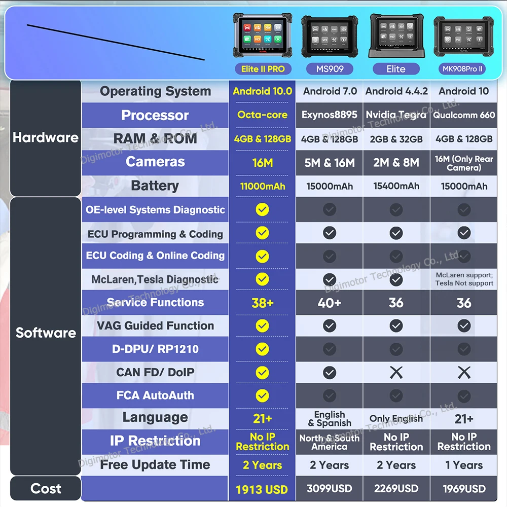 3.Mclaren & Tesla Diagnostics: No-IP limited version Elite II mechanic scanner support luxury cars diagnosis, such as Porsche, Maserati, McLaren,Tesla, etc.