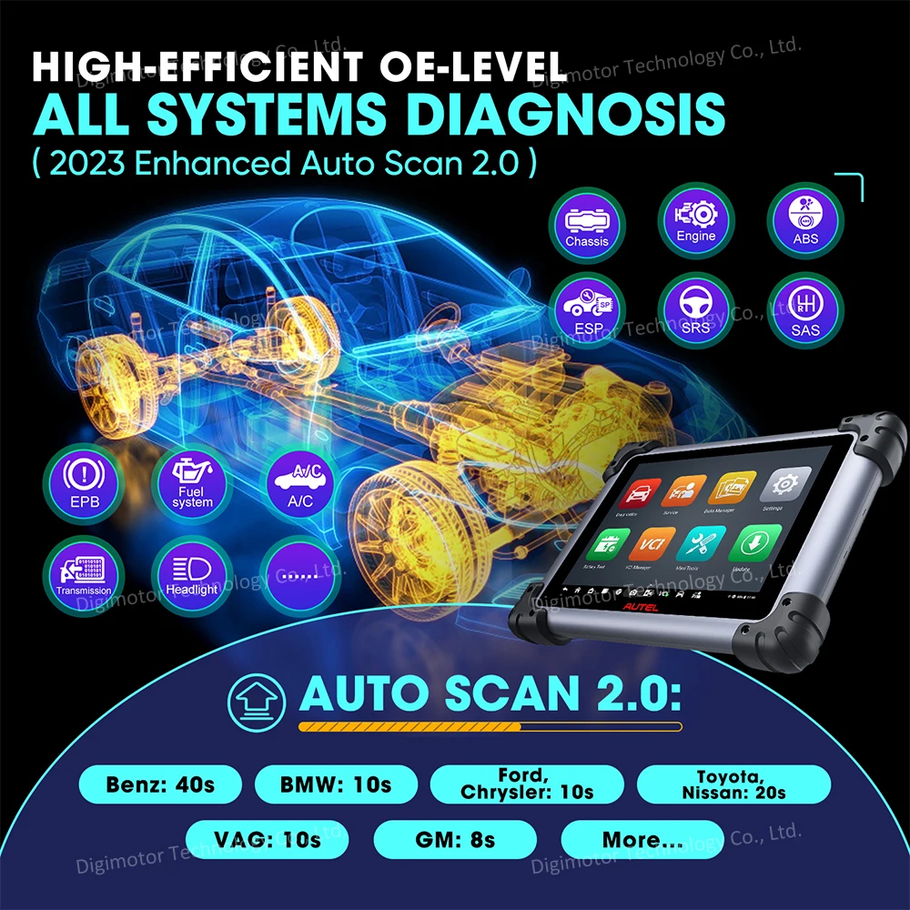 2025 newest technology AutoScan 2.0 to Elite ii pro, which is 20% ahead of others. Auto VIN, Scan VIN, Scan License. It can scan all systems in seconds, and has faster speeds: GM<8s, BM.W Ford Chrysler<10s, PSA Renault Hyundai KIA<15s.