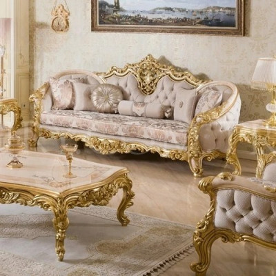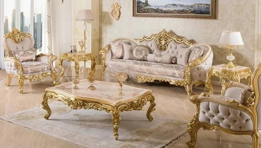 أطقم أرائك أثاث فاخرة مع طاولات وكراسي قهوة أطقم أرائك مخملية صلبة مصنوعة يدويًا من الخشب الملكي التركي
