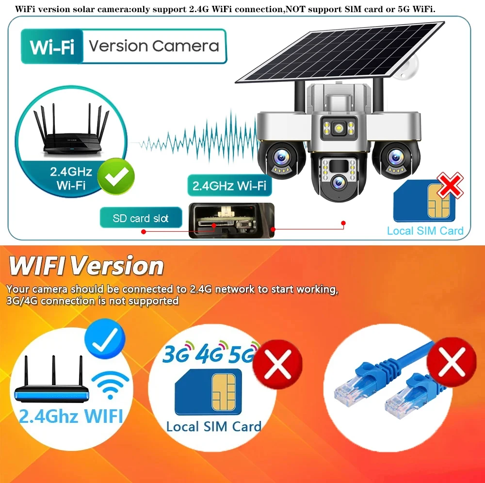 شبكة إصدار كاميرا WiFi:يدعم فقط 2.4G WiFi، ولا يدعم بطاقة SIM 4G و5G WiFi.