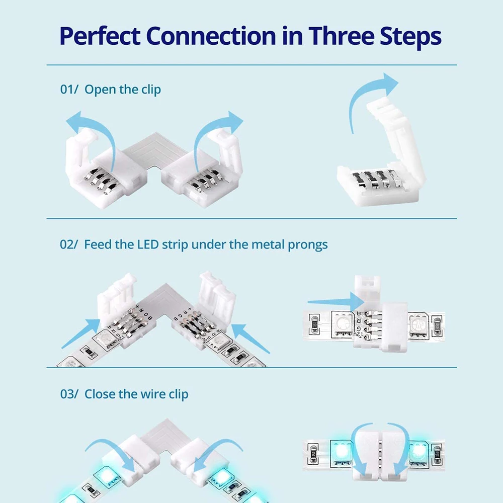 طريقة اتصال بسيطة:قم بتوصيل شريط إضاءة RGB LED الخاص بك بسهولة عن طريق شقه في موصل LED وتثبيته بالغطاء من أجل اتصال ثابت ومستقر.