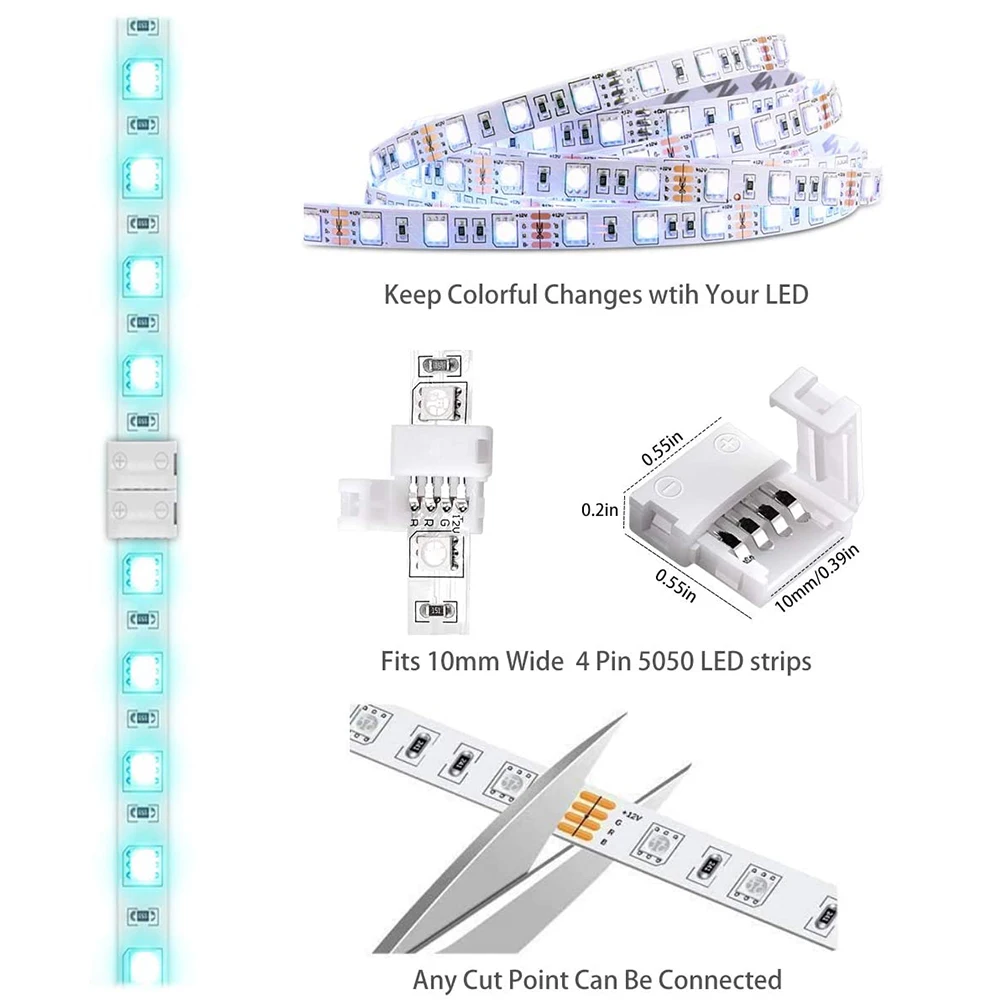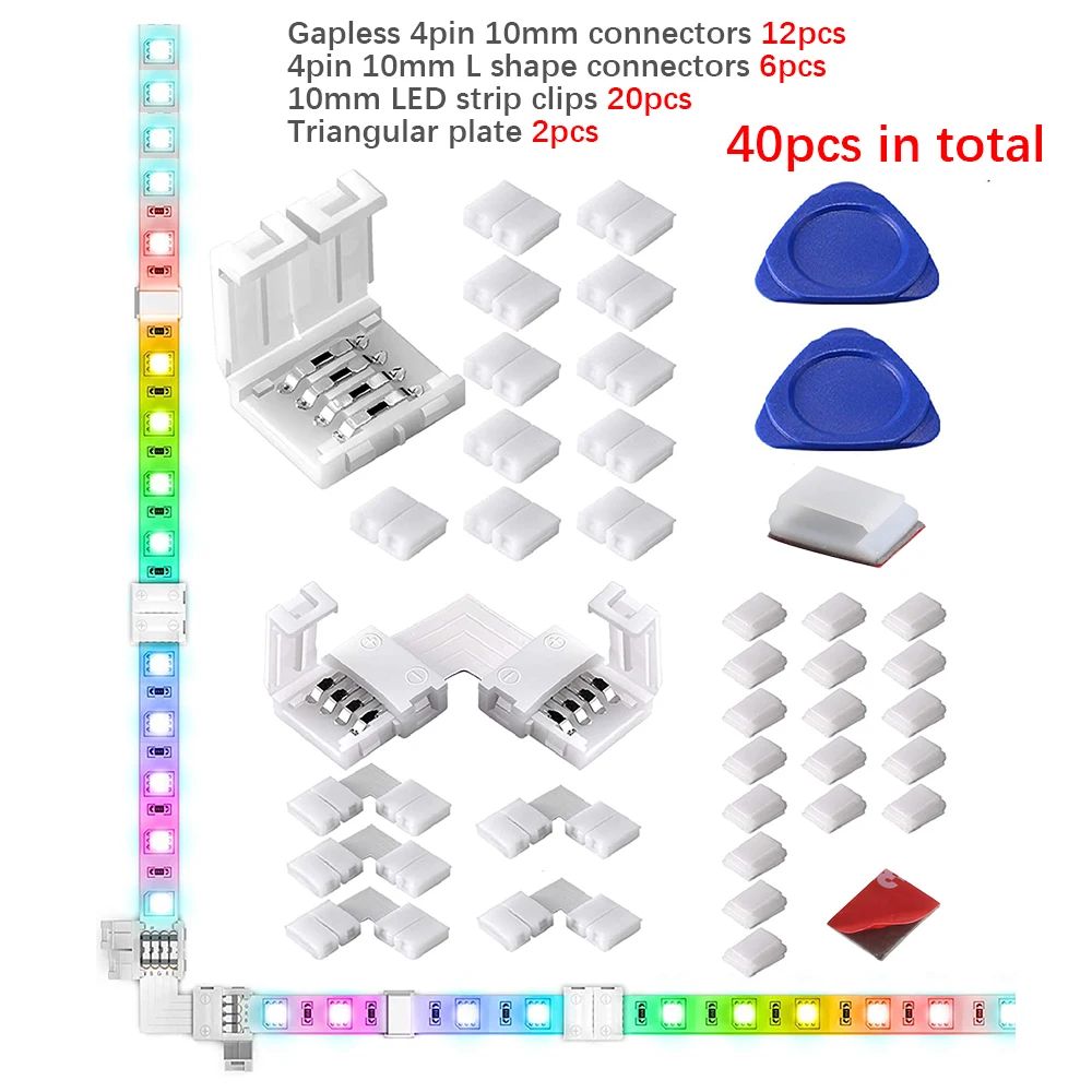 موصلات إضاءة شريط LED 40 قطعة، 10 مم غير سلكية 4 دبوس 5050 RGB مجموعة موصلات شرائط إضاءة LED، موصلات بدون فجوات، موصلات زاوية لشريط LED متعدد الألوان 5 فولت 12 فولت 24 فولت