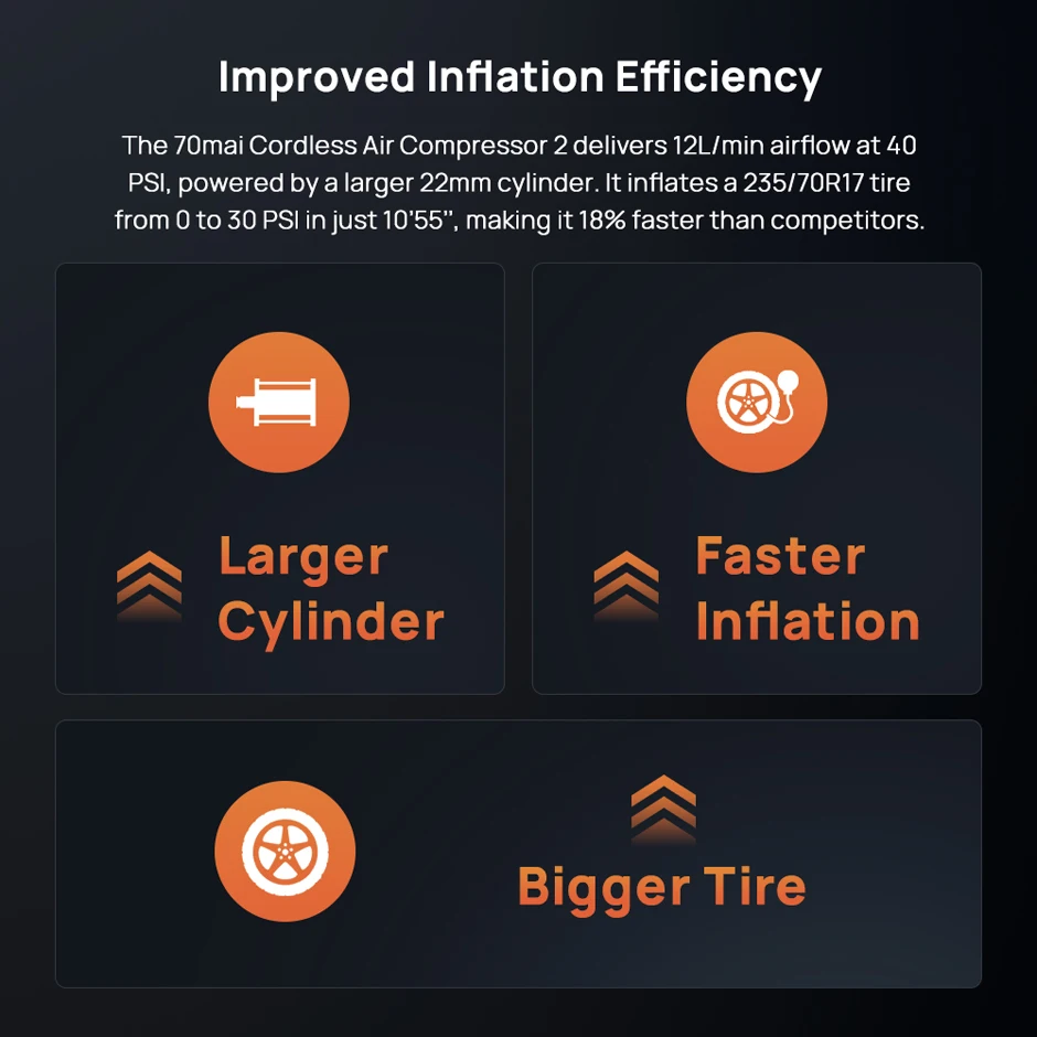 يوفر ضاغط الهواء اللاسلكي 70mai 2 تدفق هواء 12 لتر/الدقيقة عند 40 رطل لكل بوصة مربعة، مدعومًا بأسطوانة أكبر مقاس 22 مم.إنه ينفخ إطار 235/70R17 من 0 إلى 30 رطل لكل بوصة مربعة بمقاس 10'55 بوصة فقط، مما يجعله كذلك18%أسرع من المنافسين.