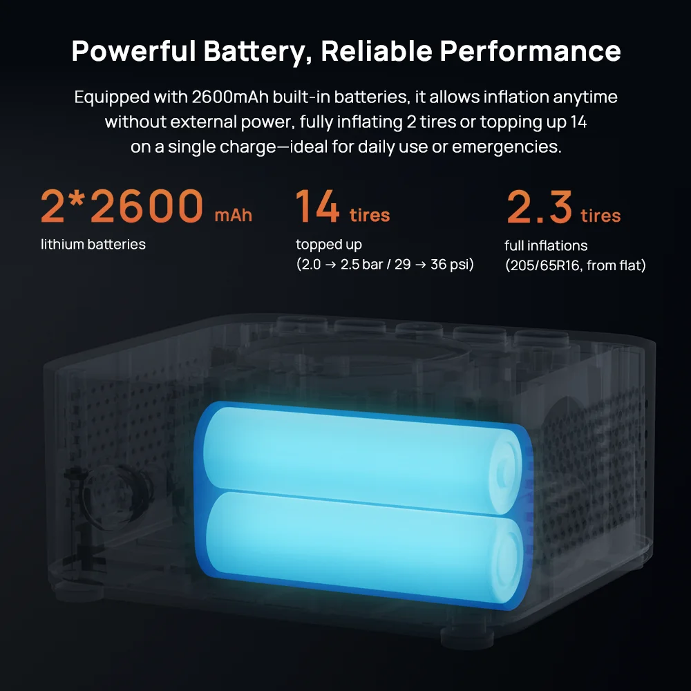 مجهزة2*2600 مللي أمبيربطاريات مدمجة، تسمح بالنفخ في أي وقت بدون طاقة خارجية، أو نفخ 2.3 إطارًا بالكامل أو رفع 14 إطارًا بشحنة واحدة - مثالية للاستخدام اليومي أو حالات الطوارئ.