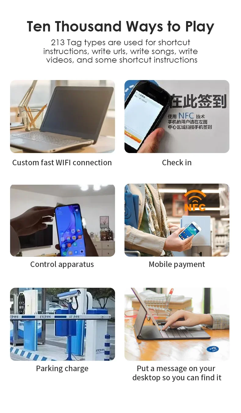 تسجيل الوصول، والدفع عبر الهاتف المحمول، والاستعلام عن معلومات المنتج، وتحديد الهوية عبر الهاتف المحمول، والتسويق عبر الهاتف المحمول، والشبكات الاجتماعية، ومشاركة بطاقات العمل، والتحكم في الوصول، وإدارة العضوية، والملصقات، والرعاية الصحية، واستعارة الكتب، وما إلى ذلك.