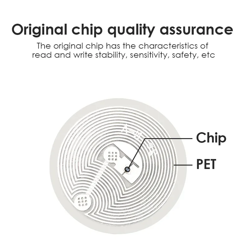 • 13.56 ميجا هرتز ISO14443A Ntag 213 رقاقة:تعمل شريحة Ntag 213 / 215 / 216 بسرعة 13.56 ميجاهرتز، مما يضمن اتصالًا سريعًا وموثوقًا.
