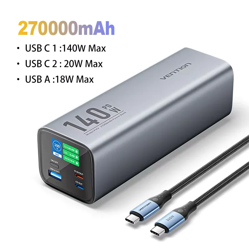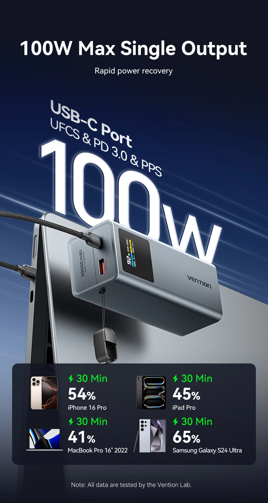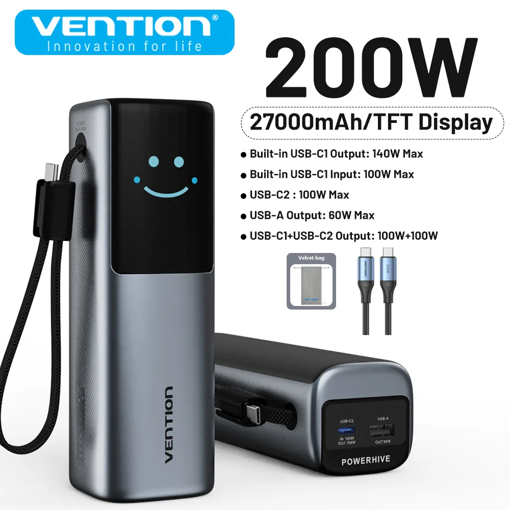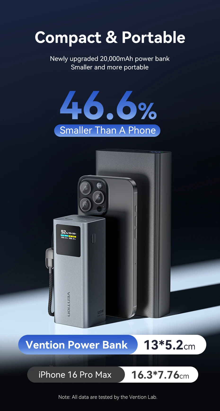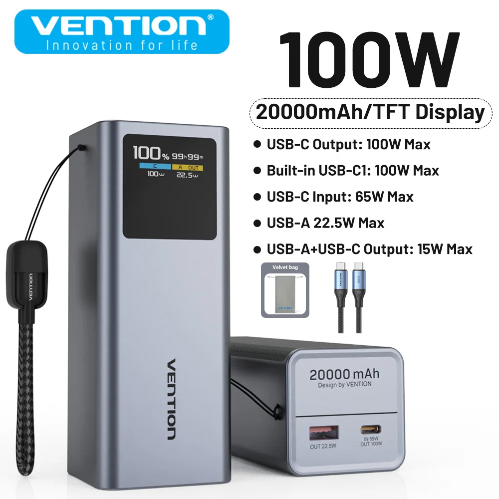 بنك طاقة Vention 20000mAh 100W Type C PD شحن سريع Powerbanks شاحن بطارية خارجي محمول لأجهزة الكمبيوتر المحمول iPhone MacBook