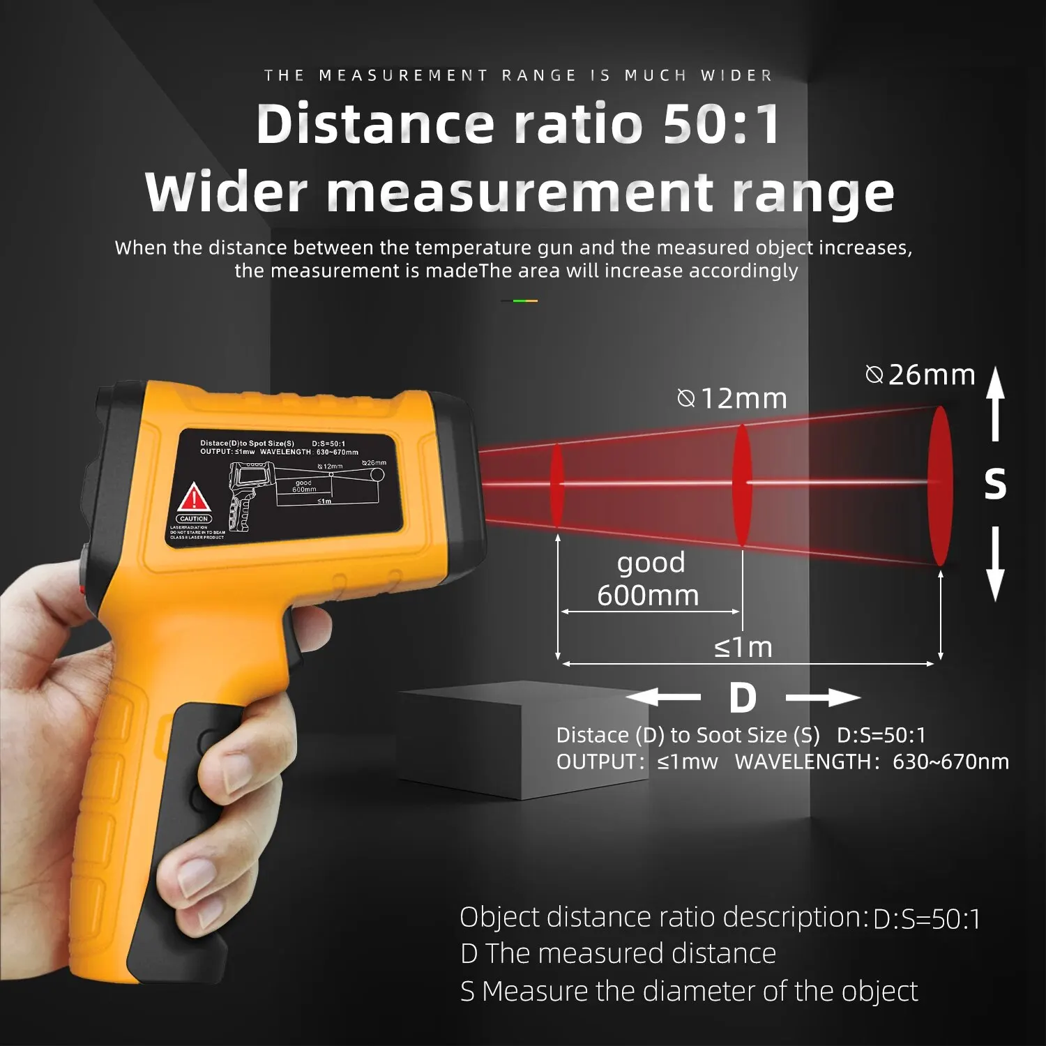 1. عند استخدام هذا المنتج لقياس درجة الحرارة ، ضع في الاعتبار النسبة بين المسافة (الطول من المنتج إلى الكائن المقاس) وحجم منطقة القياس ، يشار إليها باسم نسبة مسافة الكائن. عندما تزداد المسافة بين المنتج والكائن المقاس ، ستزيد مساحة القياس وفقًا لذلك.