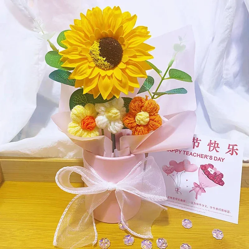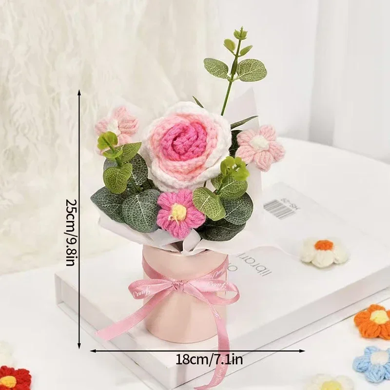 محبوك باقة الزهور الكروشيه الورد الزهور المعانقة دلو هدايا عيد المعلم غرفة المعيشة مكتب الديكور الوردي